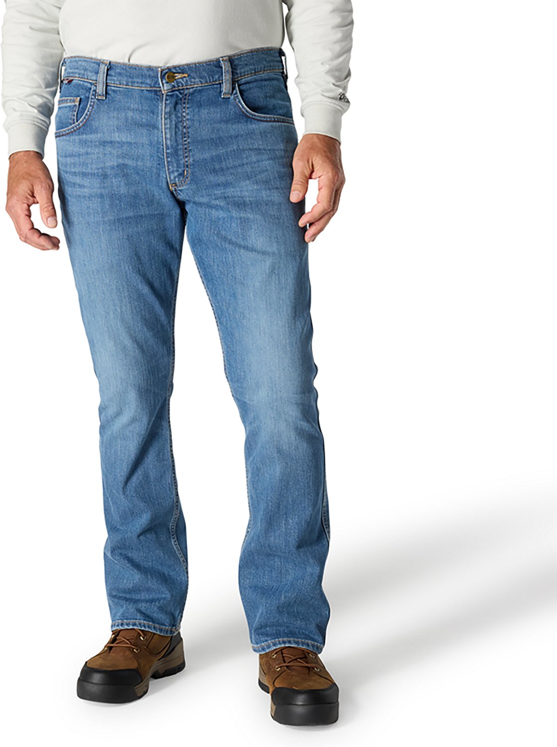 Look your best when you wear the Carhartt Men's FR Relaxed Bootcut Rugged Flex® Jeans. They are made of 99% cotton and 1% spandex. The Rugged Flex® technology stretches and flexes with you as you move, and their 2 reinforced back pockets securely store your items. The comfortable fit in the seat, thigh, and cuffs fit over most work boots.