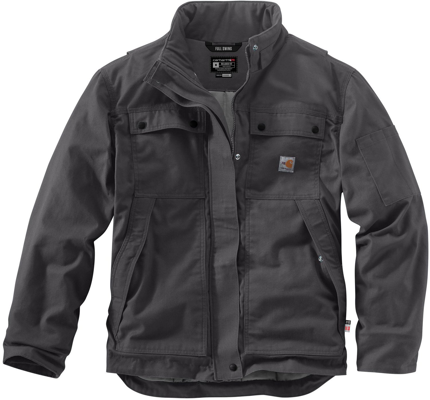 Stay protected on the job in the Carhartt Men's Full Swing Quick Duck Flame Resistant Coat. The fabric features Quick Duck® canvas for a lightweight feel and is insulated with 3M™ Thinsulate™ Platinum material to trap in body heat. The jacket is equipped with Rain Defender® technology to repel water and Nomex® flame-resistant taping for safety. Plus, the sleeves and elbows boast stretch panels for plenty of mobility.