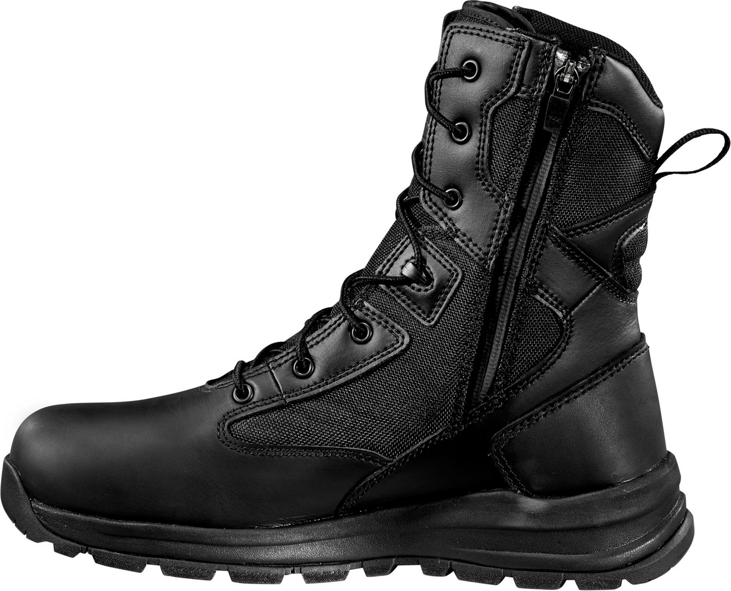 Be comfortable and protected on the job in the Carhartt Men's Gilmore Waterproof Side Zip 8 in Work Boots. The Carhartt Lightweight Durable midsoles with Insite cradle your feet in cushioning, and the leather and abrasion-resistant Carastrong™ fabric uppers deliver resilience. The Storm Defender™ waterproof membranes help keep water out and cool air flowing in, and the Carhartt outdoor ready rubber lug outsoles help you remain stable on uneven terrains.