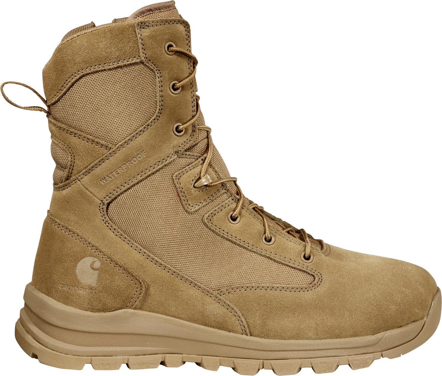 Be comfortable and protected on the job in the Carhartt Men's Gilmore Waterproof Side Zip 8 in Work Boots. The Carhartt Lightweight Durable midsoles with Insite cradle your feet in cushioning, and the leather and abrasion-resistant Carastrong™ fabric uppers deliver resilience. The Storm Defender™ waterproof membranes help keep water out and cool air flowing in, and the Carhartt outdoor ready rubber lug outsoles help you remain stable on uneven terrains.