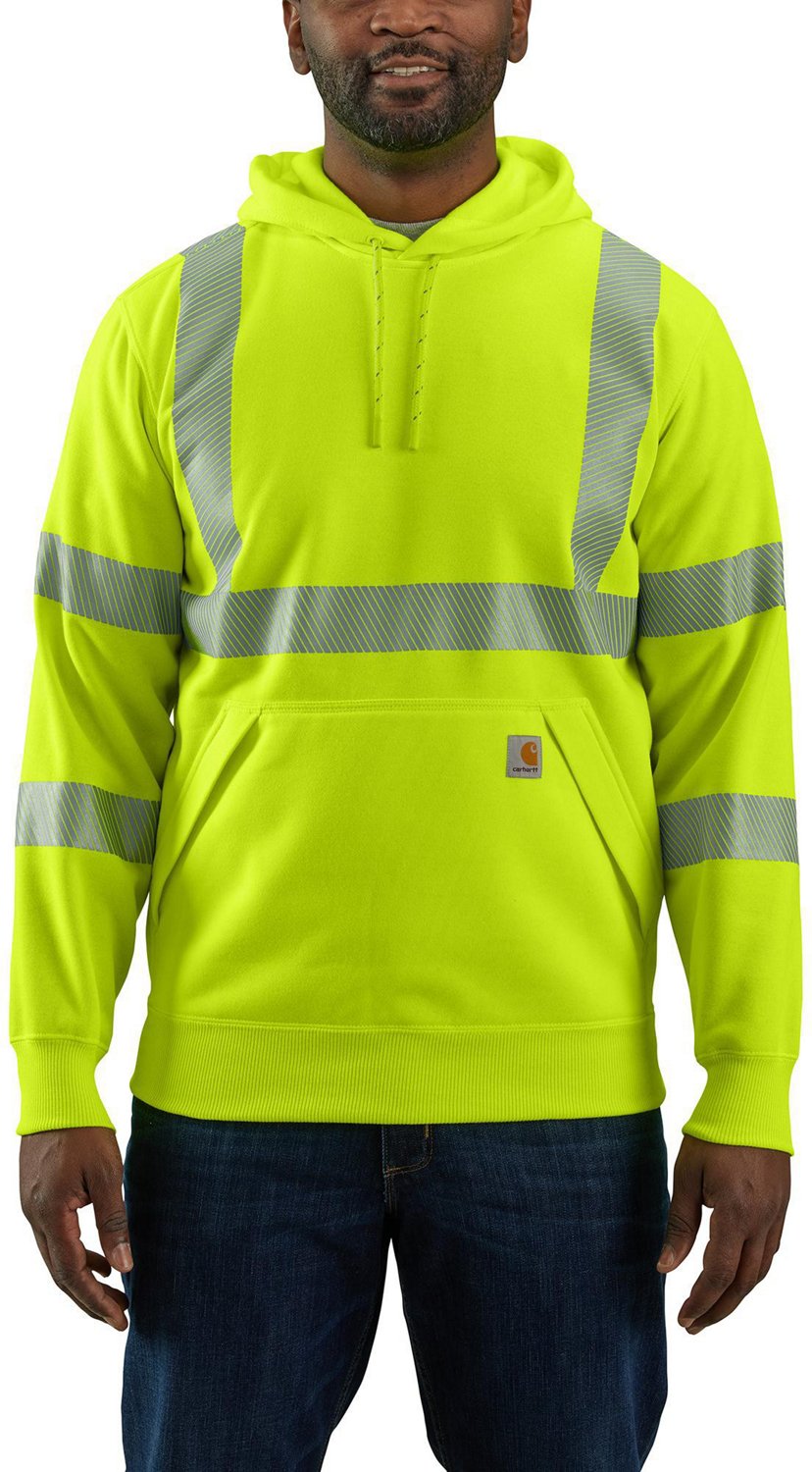Stay warm and dry in the Carhartt Men's High-Visibility Midweight Hoodie. This hoodie is made of polyester fleece that seals in the heat and has elastic cuffs and waist to keep out the cold. The Rain Defender® technology forces light rain and water to bead up and roll right off to keep you dry.
