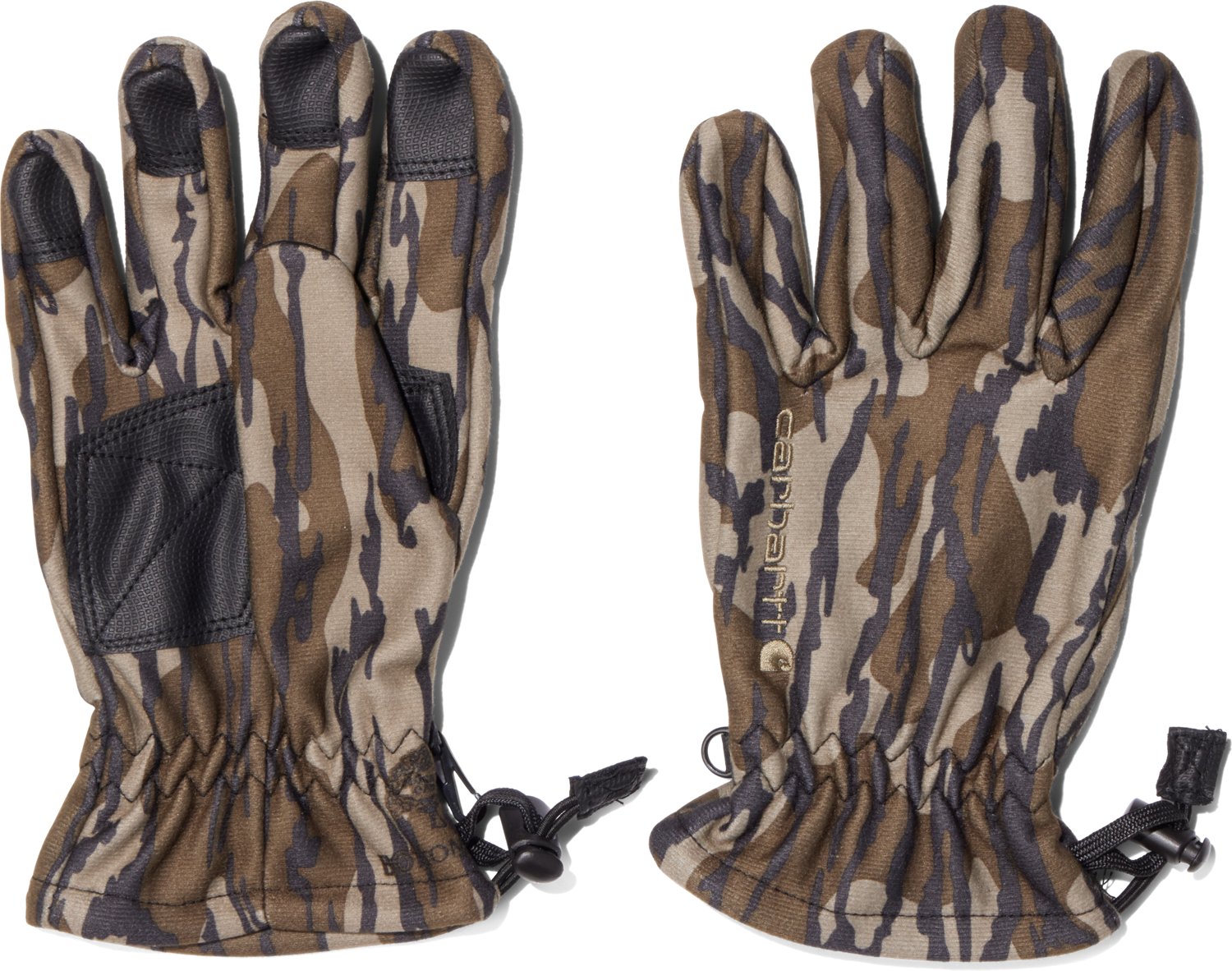 Keep your hands safe on the job with these Carhartt Men's Hunt Fleece Camo Gloves. They are made with 100% polyester shells and lining for rugged durability, and they feature barrel and cord cinch cuff closures for a secure fit.