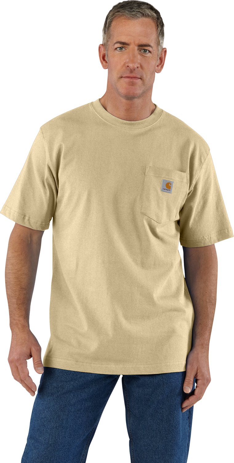 The Carhartt Men's K87 Short Sleeve Workwear Pocket T-shirt is made of a 60% cotton/40% Polyester jersey knit for a soft feel and comfortable wear and features a left chest pocket with the Carhartt logo and a rib-knit collar. Side-seam construction minimizes twisting for enhanced comfort. Original fit.