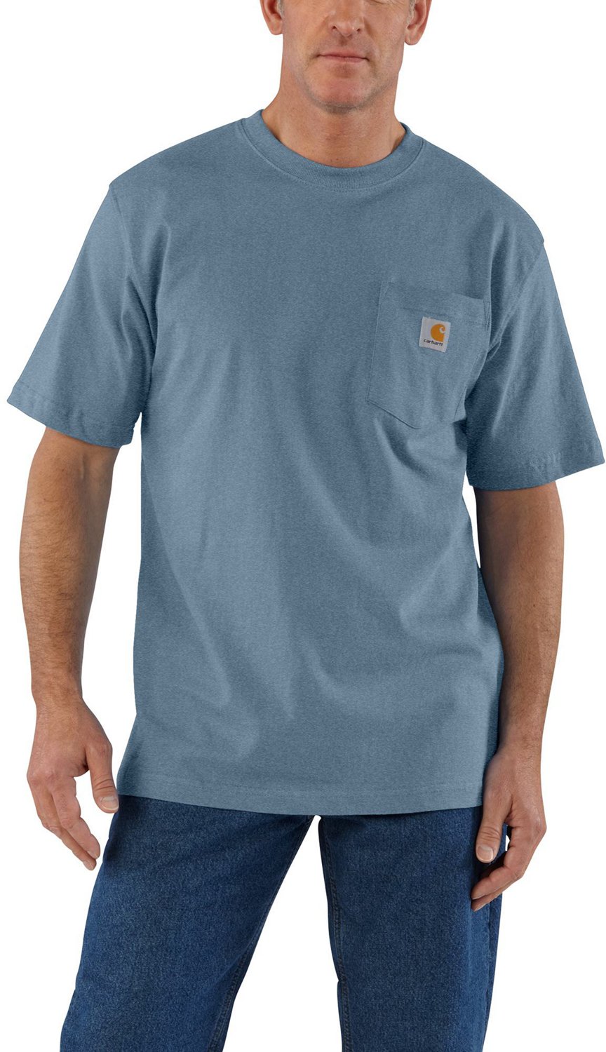 The Carhartt Men's K87 Short Sleeve Workwear Pocket T-shirt is made of a 60% cotton/40% Polyester jersey knit for a soft feel and comfortable wear and features a left chest pocket with the Carhartt logo and a rib-knit collar. Side-seam construction minimizes twisting for enhanced comfort. Original fit.