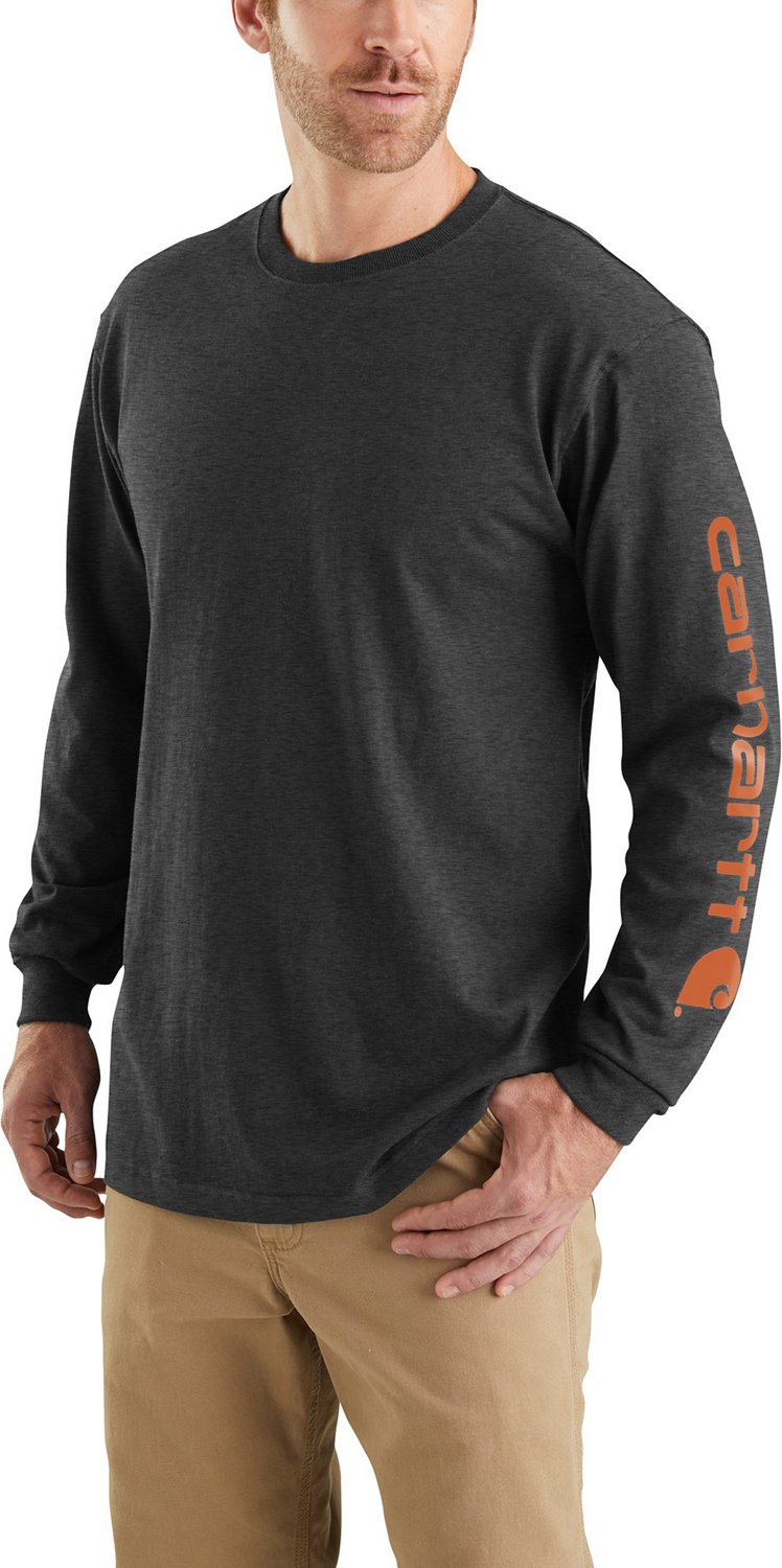 Great for keeping you warm on the job site, the Carhartt Men's Long Sleeve Graphic Logo T-shirt is made of 100% cotton knit jersey for a soft feel and comfortable wear and features rib-knit cuffs and a rib-knit crew neck with a tagless neck label. Side-seam construction helps to minimize twisting. Carhartt logo printed on the left sleeve.