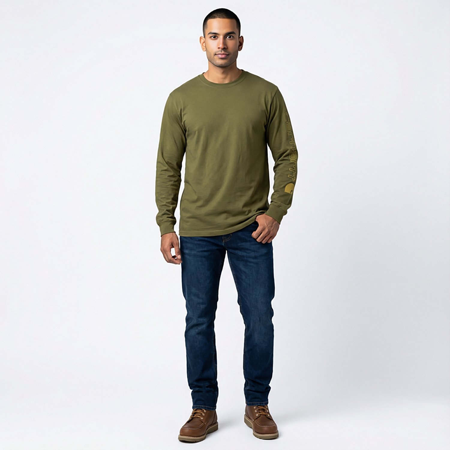 Great for keeping you warm on the job site, the Carhartt Men's Long Sleeve Graphic Logo T-shirt is made of 100% cotton knit jersey for a soft feel and comfortable wear and features rib-knit cuffs and a rib-knit crew neck with a tagless neck label. Side-seam construction helps to minimize twisting. Carhartt logo printed on the left sleeve.
