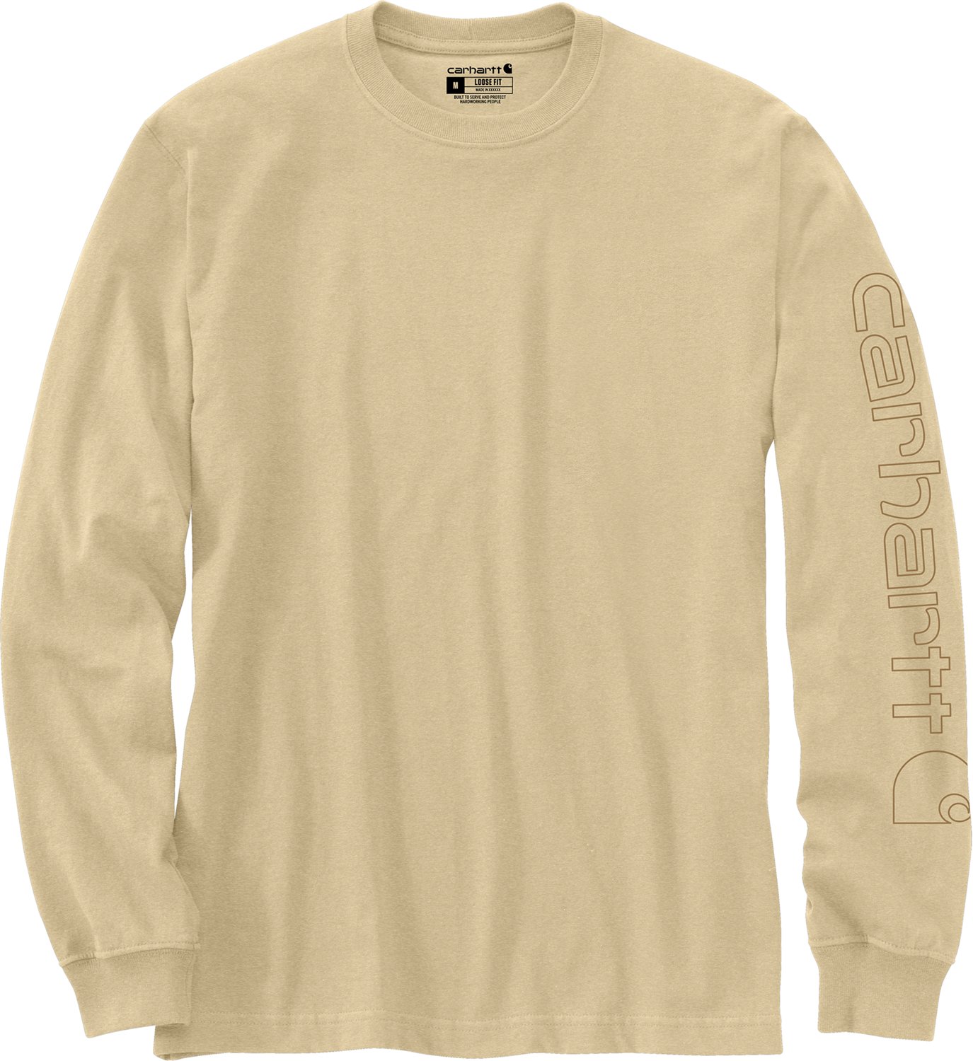 Great for keeping you warm on the job site, the Carhartt Men's Long Sleeve Graphic Logo T-shirt is made of 100% cotton knit jersey for a soft feel and comfortable wear and features rib-knit cuffs and a rib-knit crew neck with a tagless neck label. Side-seam construction helps to minimize twisting. Carhartt logo printed on the left sleeve.