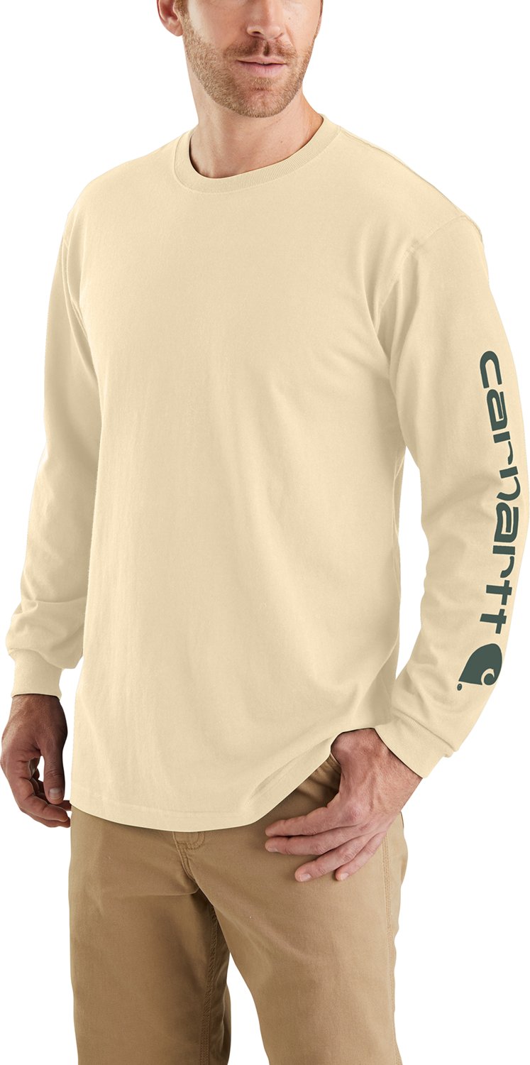 Great for keeping you warm on the job site, the Carhartt Men's Long Sleeve Graphic Logo T-shirt is made of 100% cotton knit jersey for a soft feel and comfortable wear and features rib-knit cuffs and a rib-knit crew neck with a tagless neck label. Side-seam construction helps to minimize twisting. Carhartt logo printed on the left sleeve.