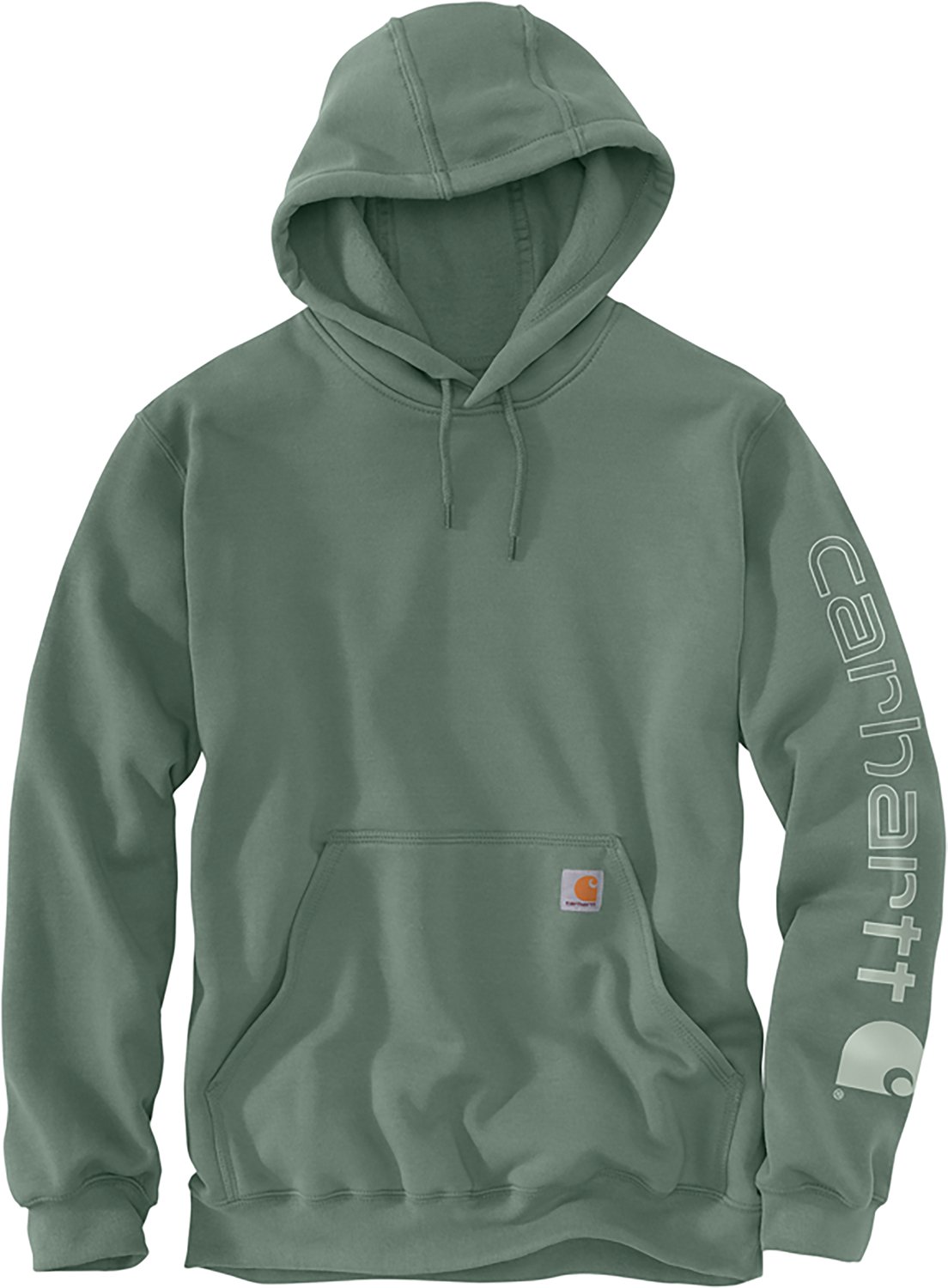Stay warm on or off the worksite in the Carhartt Men's Loose Fit Midweight Signature Sleeve Logo Hooded Sweatshirt. Made of midweight 50% cotton and 50% polyester for warm, comfortable wear, this hoodie features a kangaroo pocket, spandex-reinforced, rib-knit cuffs and waistband and a hood with a draw cord closure. Carhartt wordmark and logo printed down the left sleeve. Original fit.