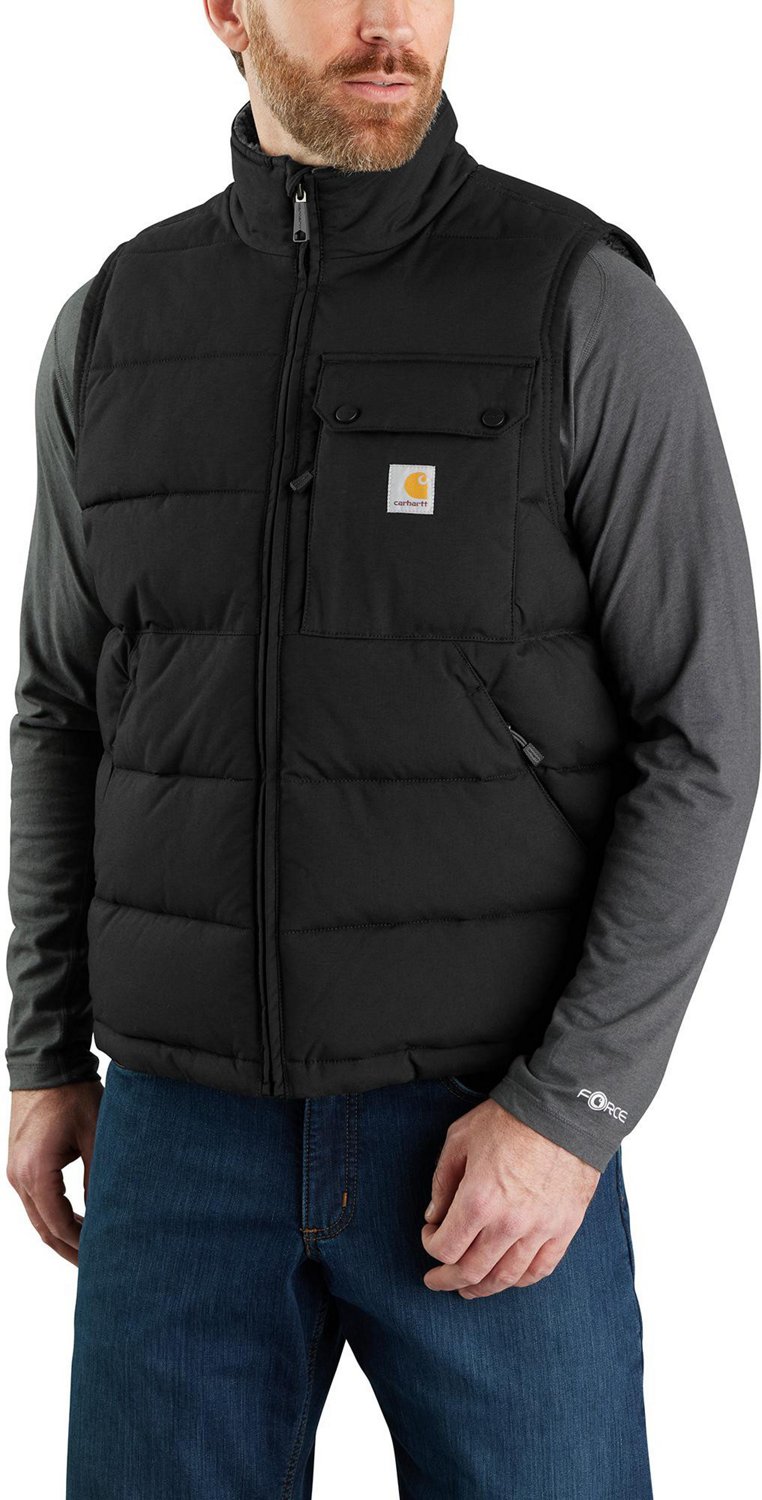 Keep your core warm and dry in the Carhartt Men's Montana Loose Fit Insulated Vest. The 100% nylon Carstrong fabric remains resilient in the elements, while the sherpa lining and faux down insulation trap in your body heat to keep you feeling cozy. The pockets both inside and outside offer ample space for your essentials, and the Wind Fighter and Rain Defender technologies help keep wind and rain at bay.