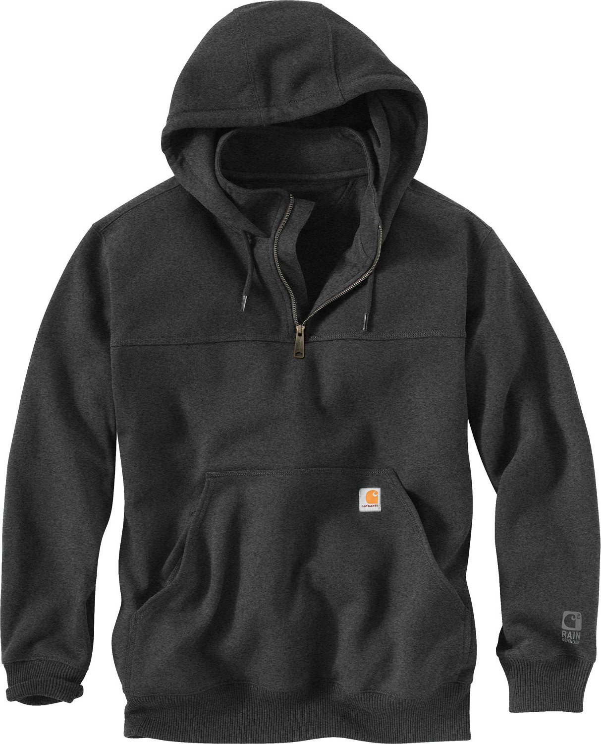 Stay warm and dry on the worksite or while running around town in the Carhartt Men's Paxton Heavyweight Hooded Zip Mock Sweatshirt, which is made of 80% cotton and 20% polyester with a Rain Defender® water-repellent finish. This hoodie features a zip-mock collar, spandex-reinforced rib-knit cuffs and waistband and a 3-piece, jersey-lined hood with a draw cord closure to help keep the cold out. Embroidered Carhartt logo.