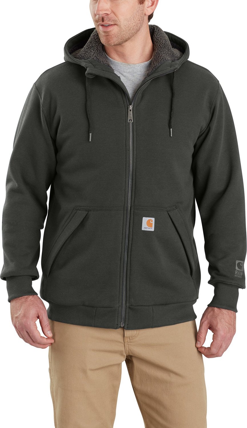 Designed with Rain Defender® technology, the Carhartt Men's Rain Defender Rockland Sherpa Lined Hooded Sweatshirt helps repel water to protect you against bad weather. The sweatshirt is made of a cotton blend for softness and offers thick sherpa lining to help you stay warm in cool conditions. Full-zip front closure.