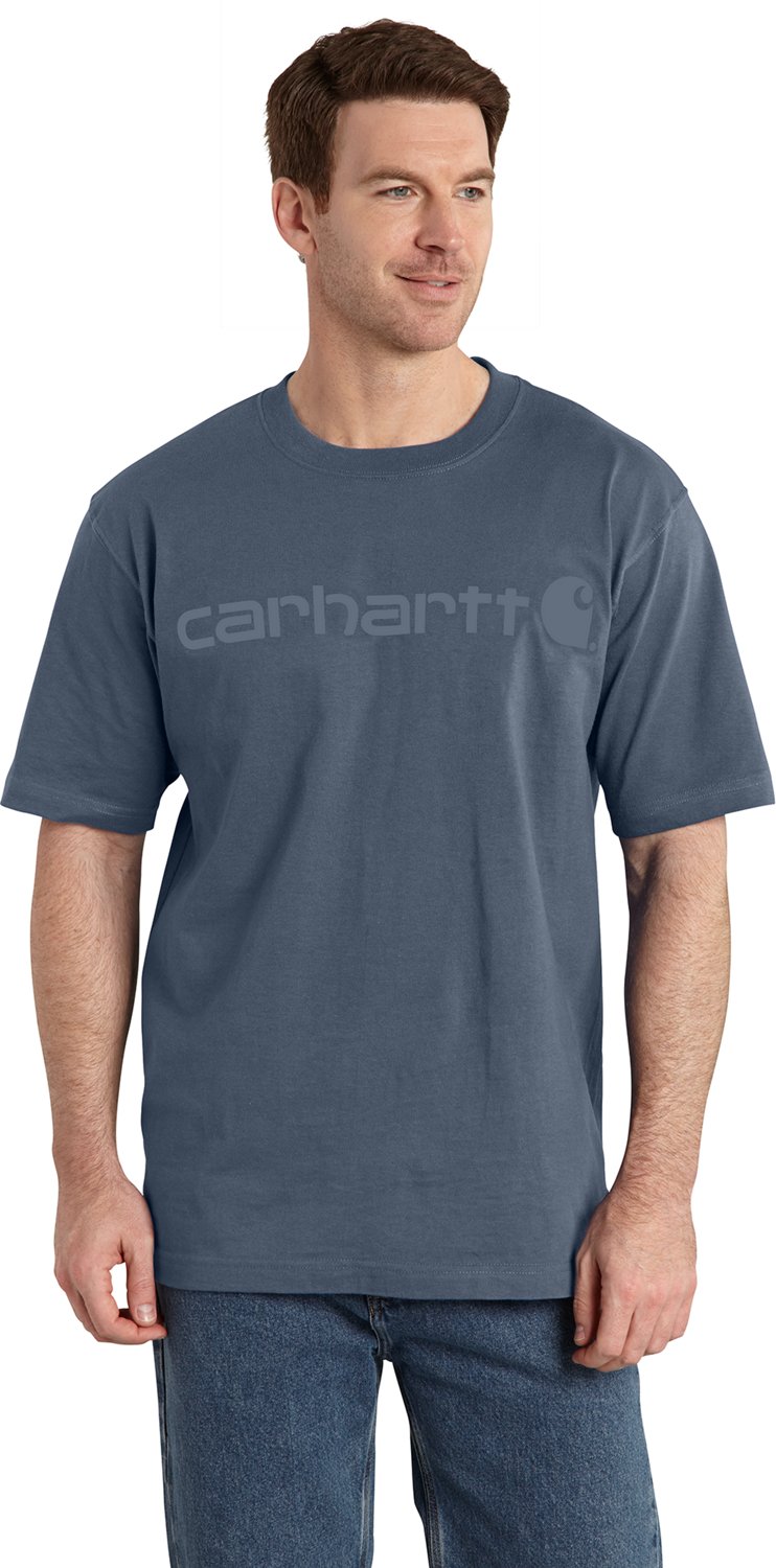 Great for work or casual wear, the Carhartt Men's Short Sleeve Logo T-shirt is made of 100% cotton knit jersey for a soft feel and comfortable wear and features a rib-knit crew neck with a tagless neck label and side-seam construction to help minimize twisting. Carhartt logo printed on the front and back.