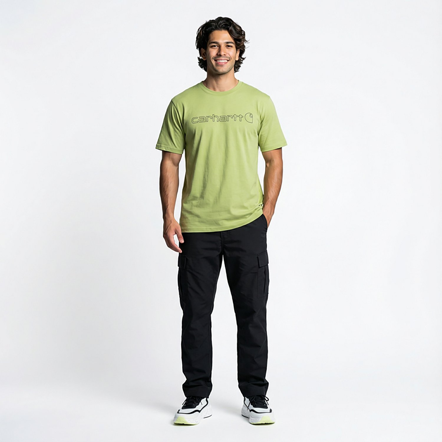 Great for work or casual wear, the Carhartt Men's Short Sleeve Logo T-shirt is made of 100% cotton knit jersey for a soft feel and comfortable wear and features a rib-knit crew neck with a tagless neck label and side-seam construction to help minimize twisting. Carhartt logo printed on the front and back.