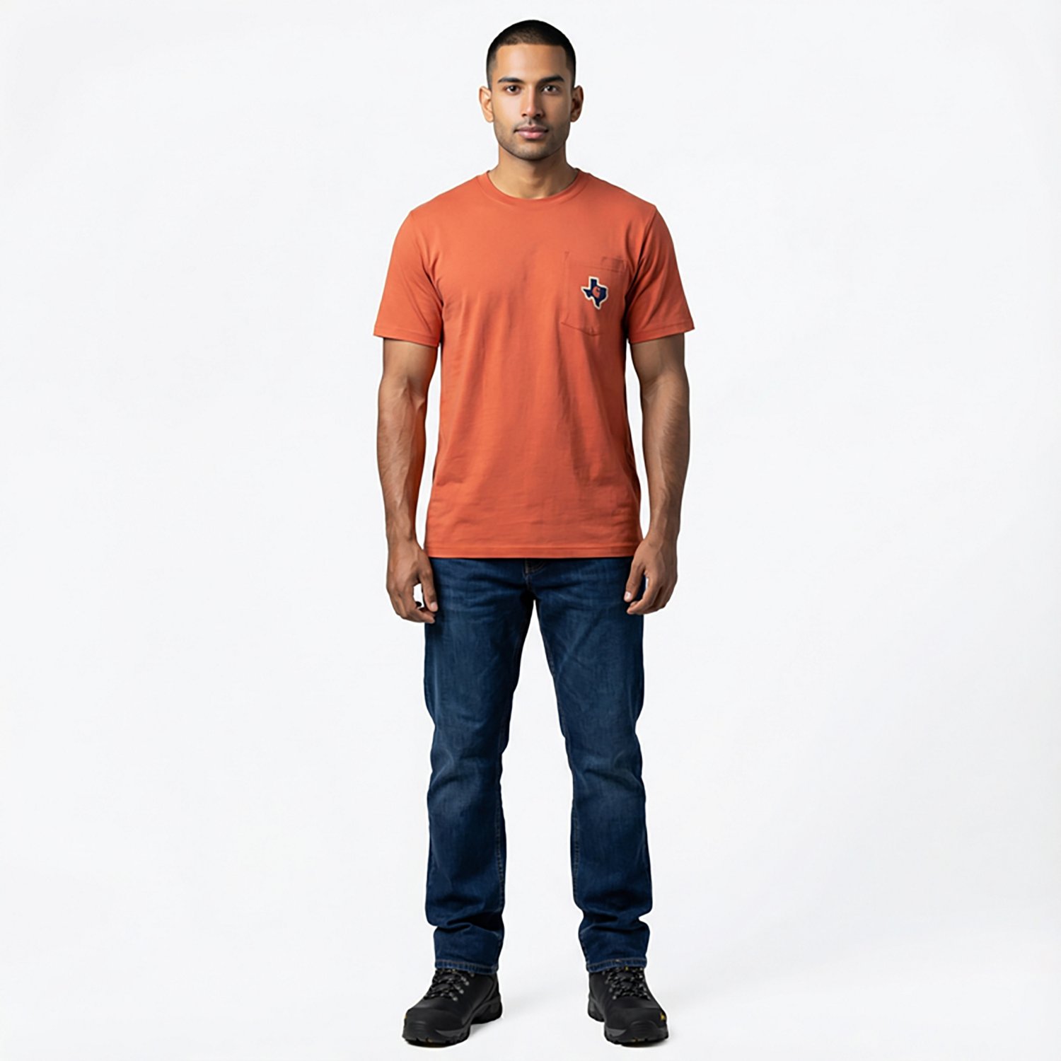 Look your best in the Carhartt Men's Texas Short Sleeve Logo T-shirt. It is made of 60% cotton and 40% polyester. The pocket is on the left chest side, and its side-seam construction minimizes twisting. The Carhartt Texas graphic is on the left-chest pocket and back.