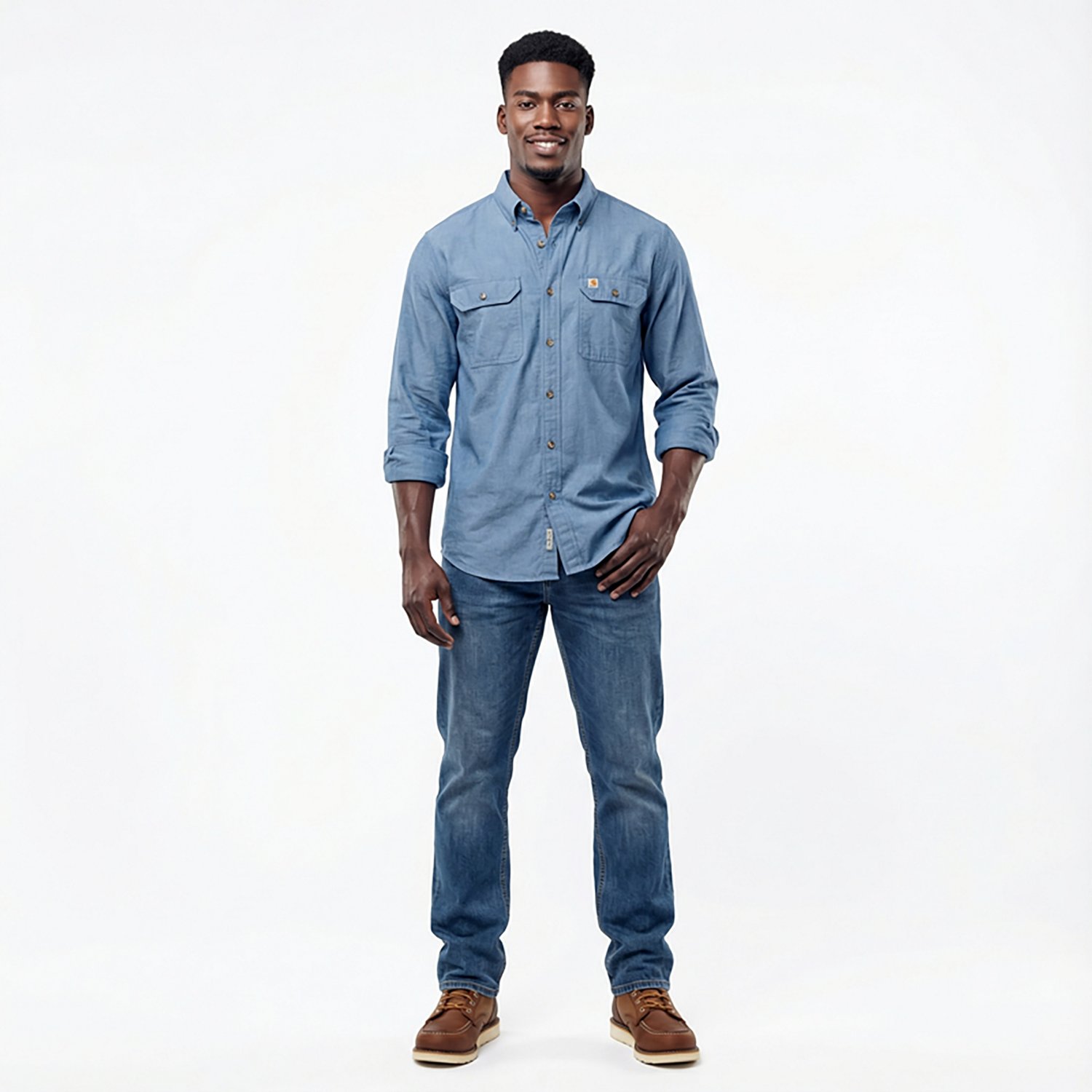 Take on the day in style and comfort wherever you sport the Carhartt Men's TW368 Original Fit Long Sleeve Shirt. The 100% cotton ringspun chambray fabric offers a soft, smooth fit and feel. The shoulder pleats encourage ease of movement. The mitered flap and button closure chest pockets provide secure storage for essentials, while the triple-stitch main seams add strength for lasting wear.