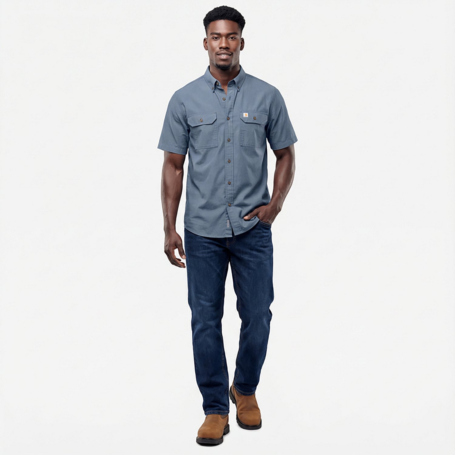 Elevate your everyday look with the comfort and utility of the Carhartt Men's TW369 Original Fit Short Sleeve Shirt. Made from 100% cotton chambray, the shirt offers comfort and lasting wear. Pleated shoulders allow free movement, while the button-down closure delivers a classic look.
