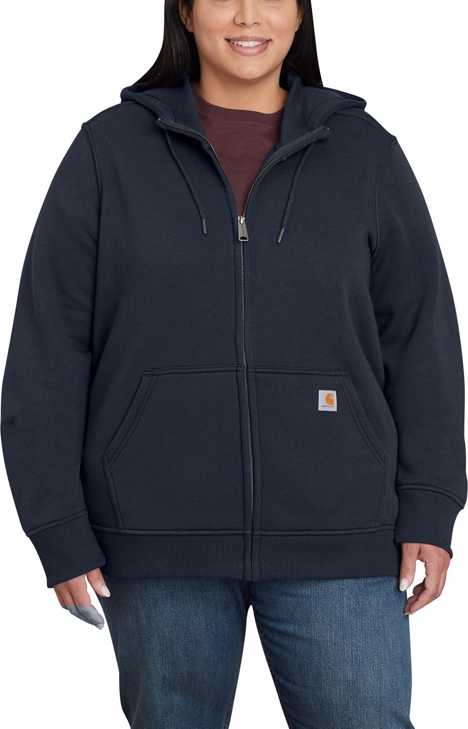 Stay warm with the Carhartt Women's Clarksburg Full-Zip Plus Size Hoodie. Constructed from heavyweight fleece with hand warmer pockets, this hoodie keeps you comfortable and cozy. It has a 3-piece hood and a full-zip closure for easy layering. Relaxed fit.