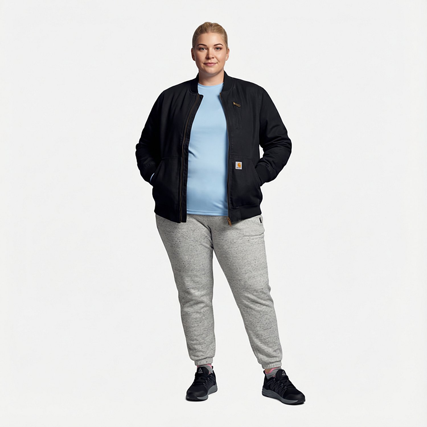 Layer up on a chilly day with the Carhartt Women's Crawford Plus Size Bomber Jacket. This classic bomber is made of durable cotton canvas with Rugged Flex® stretch technology for ease of movement. The mesh lining adds breathability, while rib knit trim provides a snug fit and a stylish look.