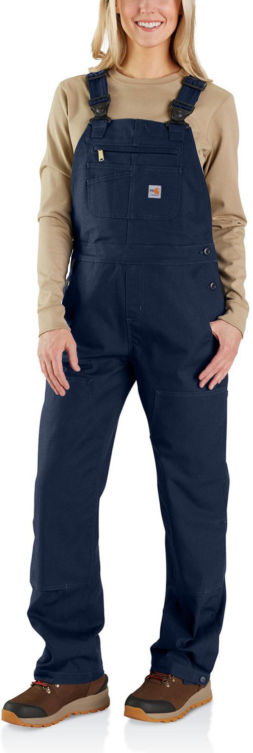 Stay safe during your work tasks with the Carhartt Women's Flame Resistant Rugged Flex Loose Fit Duck Bib Overalls. The cotton and elastane FR duck construction offers a soft and stretchy feel, and the Rugged Flex® durable stretch technology allows you to move with ease. The 2 reinforced back pockets, lower-front ledge pockets, multiple tool and utility pockets and a multi compartment bib pocket provides room to conceal items, and the triple-stitched main seams deliver strong reinforcement.
