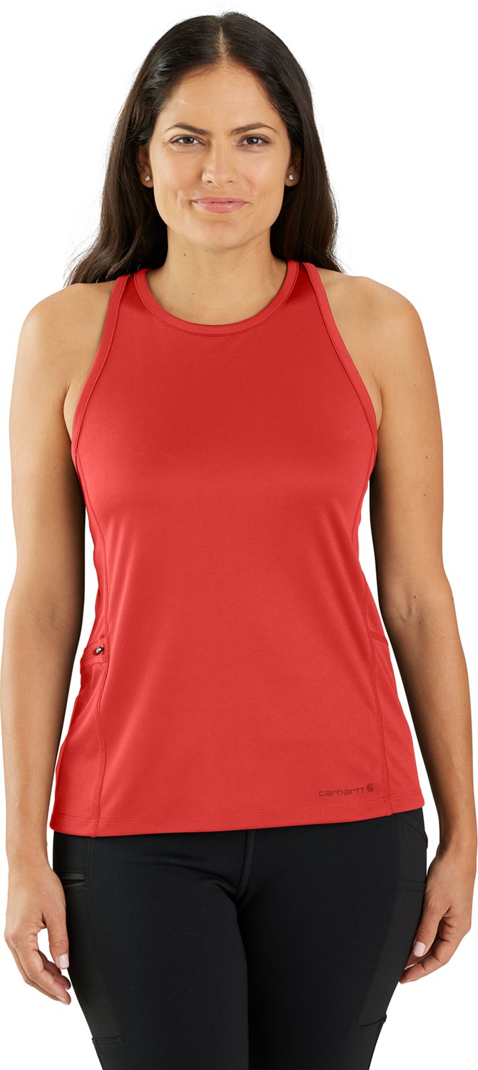 Keep cool with the Carhartt Women's Force Tank Top. It is made of 100% polyester. The Carhartt Force® technology helps fight odors, and its FastDry® technology wicks away sweat amplifying comfort. The zippered pocket on the right panel has a hidden card pocket.
