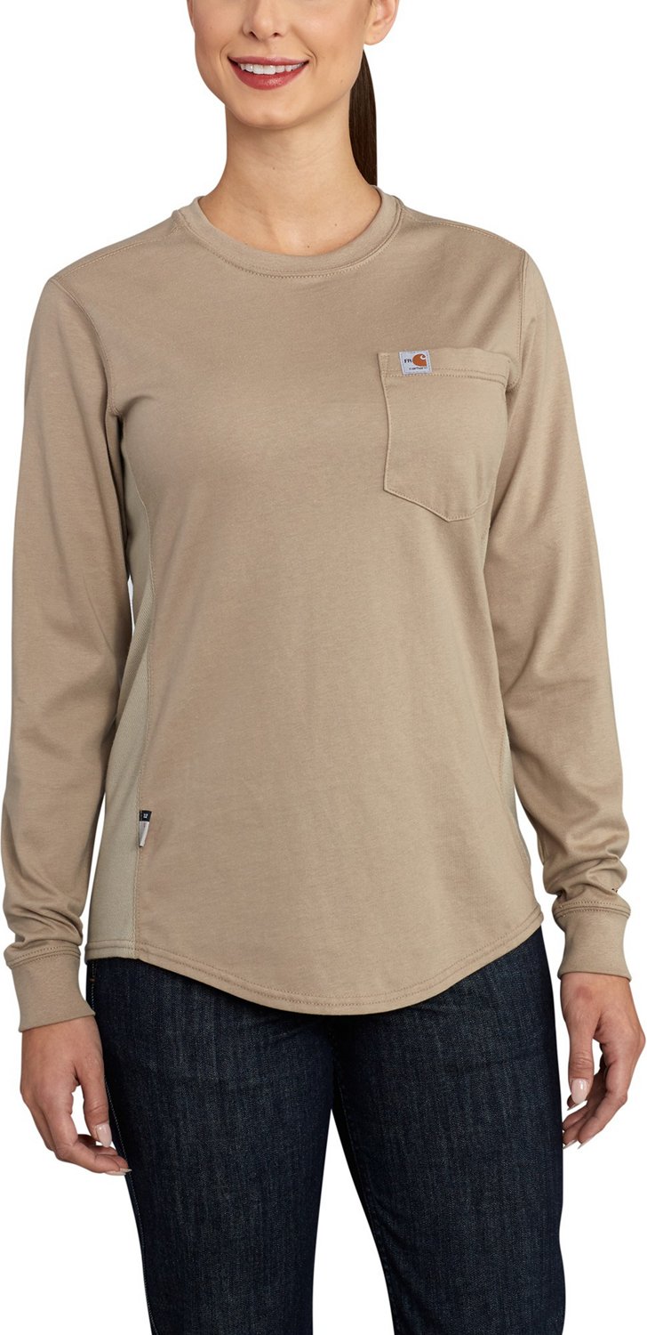 Be prepared for almost anything that the work day may throw at you when you put on the Carhartt Women's Flame Resistant Force Long Sleeve Work T-shirt. The flame-resistant (Flame Resistant) jersey knit cotton comes with built-in FastDry® technology to help wick away sweat for a dry and comfortable feel that lasts, while the Carhartt Force® scent control helps keep you smelling Flame Resistantesh so you can keep feeling confident.