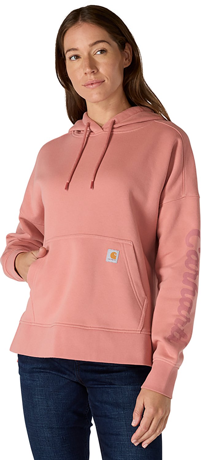 Thanks to this Carhartt Women's Hoodie's cotton-polyester construction, long drop-shoulder sleeves with ribbed cuffs, ribbed waistband and 3-piece hood, you're sure to stay warm on the jobsite all workday long. The Carhartt heart graphic on its back, flanked by a Carhartt logo graphic on its left sleeve, shows off both your sense of style and your appreciation of the brand's reputation for durability.