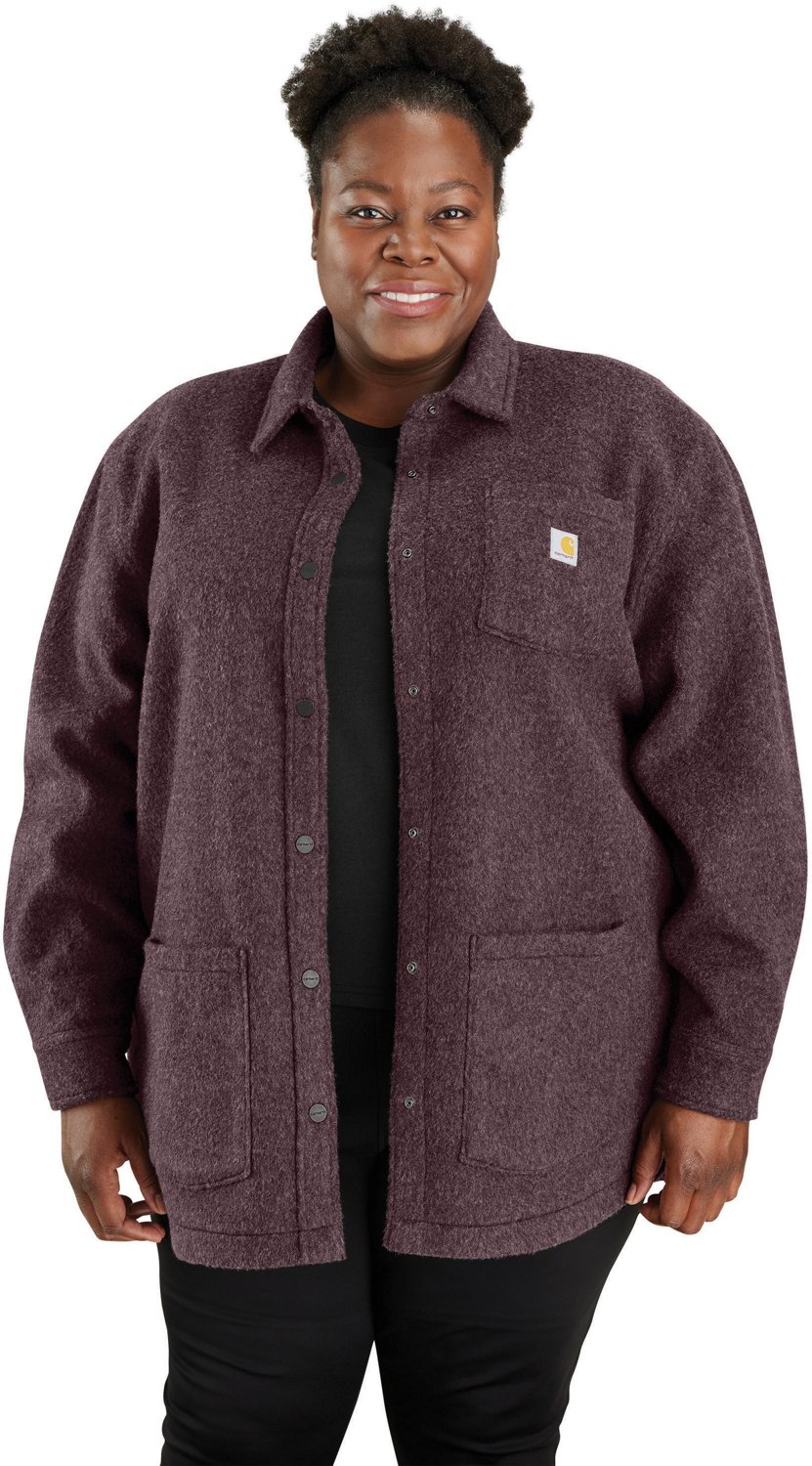 When the temperature drops, throw on the Carhartt Women's Loose Fit Fleece Shirt Jacket. The polyester-acrylic fleece fabric delivers a wool-like feel perfect for a chilly day, while the loose fit offers plenty of room for layering. The 3 pockets keep small belongings handy.