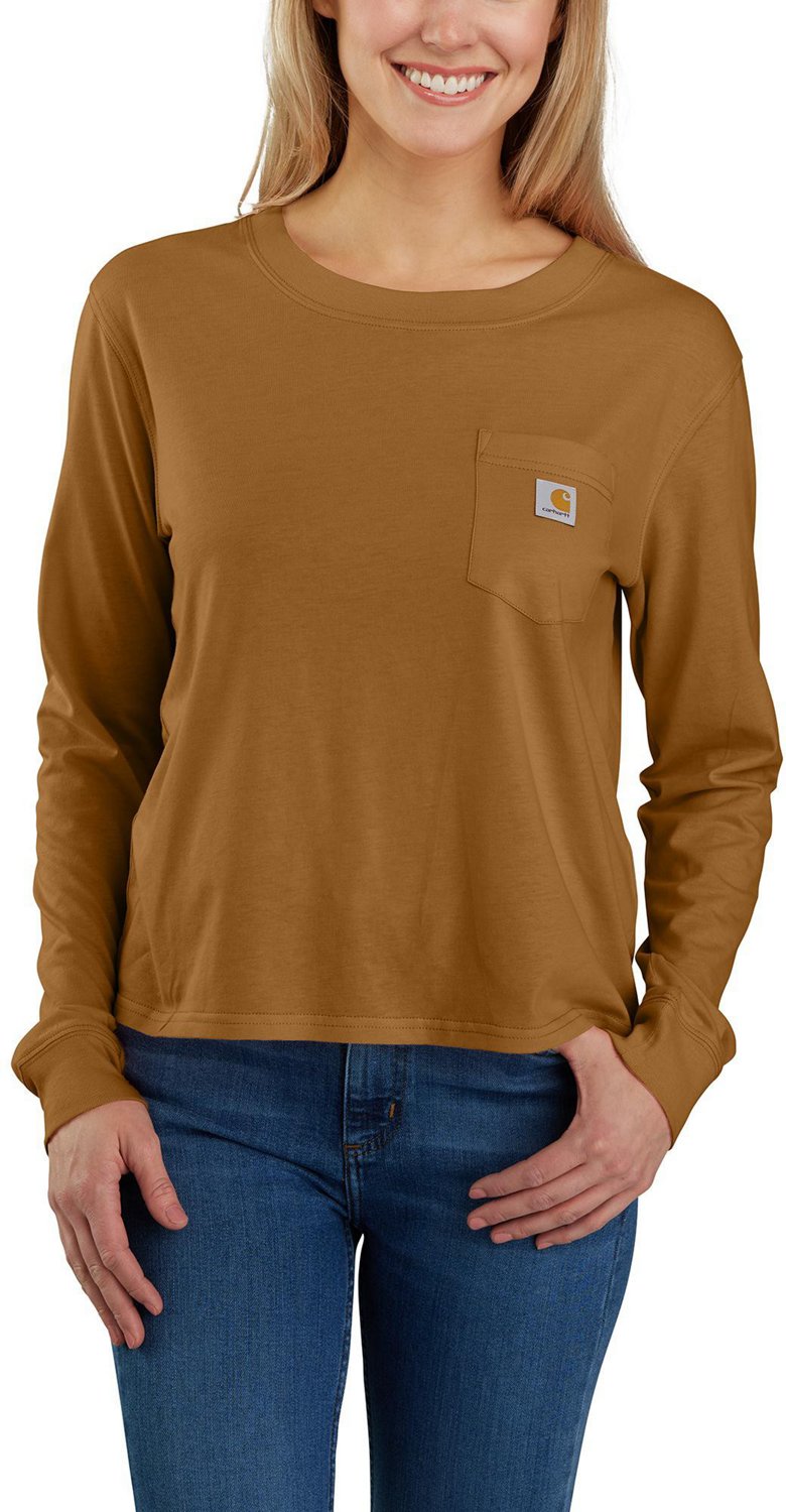 Celebrate your favorite brand with the Carhartt Women's Loose Fit Lightweight Pocket Crewneck Long Sleeve T-shirt. This comfortable top features cotton blend knit fabric, a loose fit and a tag-free neck label, helping you stay comfortable whether at work or play. A brand graphic on the chest pocket elevates your look.
