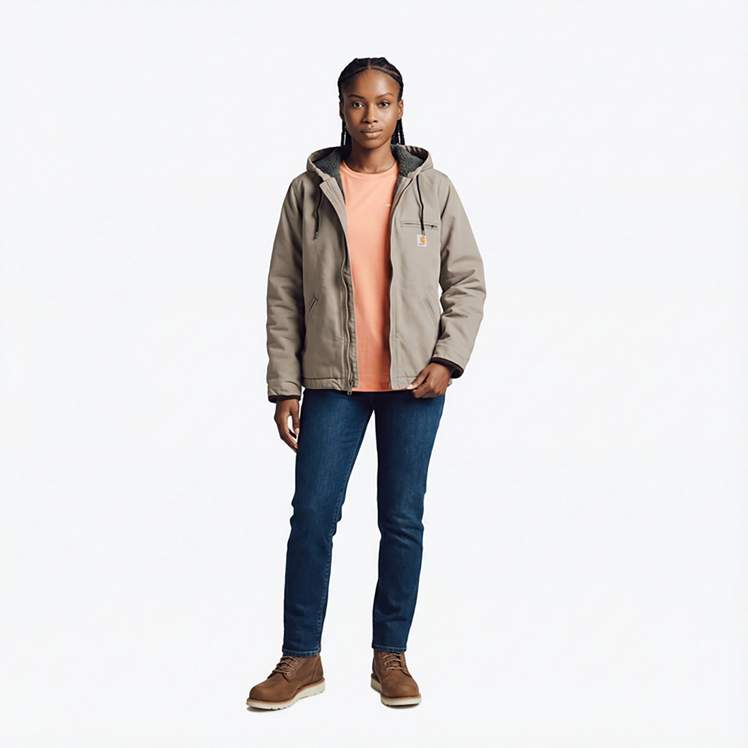Stay warm wearing the Carhartt Women's Loose Fit Washed Duck Sherpa-Lined Hooded Jacket. This jacket is made from 100% ringspun cotton washed duck for comfort and durability. The sherpa-lined body provides softness and warmth, while the attached sherpa-lined hood with a drawstring protects against the elements.