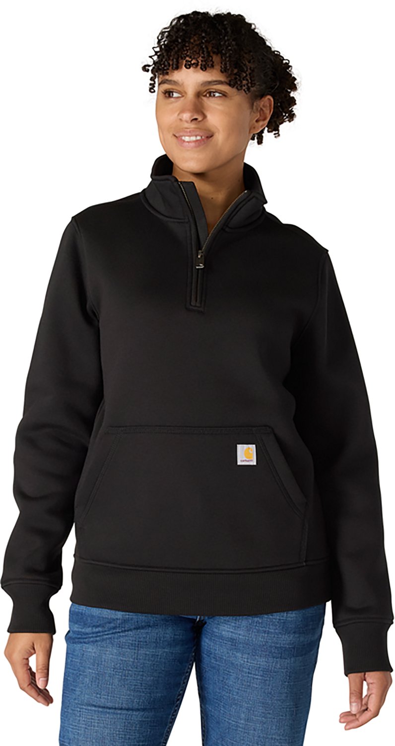 Look your best when you wear the Carhartt Women's Mock Neck 1/4-Zip Sweatshirt. It is made of 55% cotton and 45% polyester. The mock-neck collar has a 1/4-length zipper closure, and its rib-knit cuffs and waist help keep out the cold. The front handwarmer pockets allow you to carry small items.