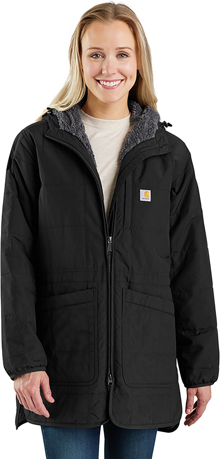 Stay warm on the jobsite with the Carhartt Women's Rain Defender Loose Fit Lightweight Insulated Coat. The nylon fabric provides a comfortable feel, while the Sherpa lining and synthetic insulation offer warmth. Built-in Storm Defender technology helps keep you dry, and the vented side hem promotes mobility.