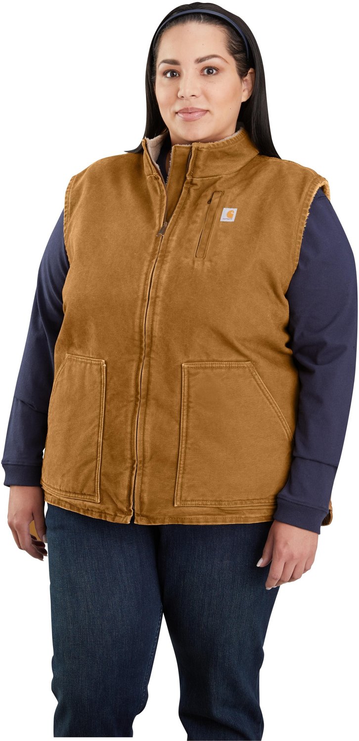 Stay warm through harsh weather wearing the Carhartt Women's Relaxed Fit Washed Duck Lined Mock Neck Plus Size Vest. The heavyweight insulated 100% ringspun washed cotton duck exterior construction offers a soft and warm feel, and the 100% polyester boucle interior build provides a long-lasting feel. The Carhartt logo on front pocket shows your brand pride, and the 2 front pockets and 1 zippered pocket allow you to conceal items.
