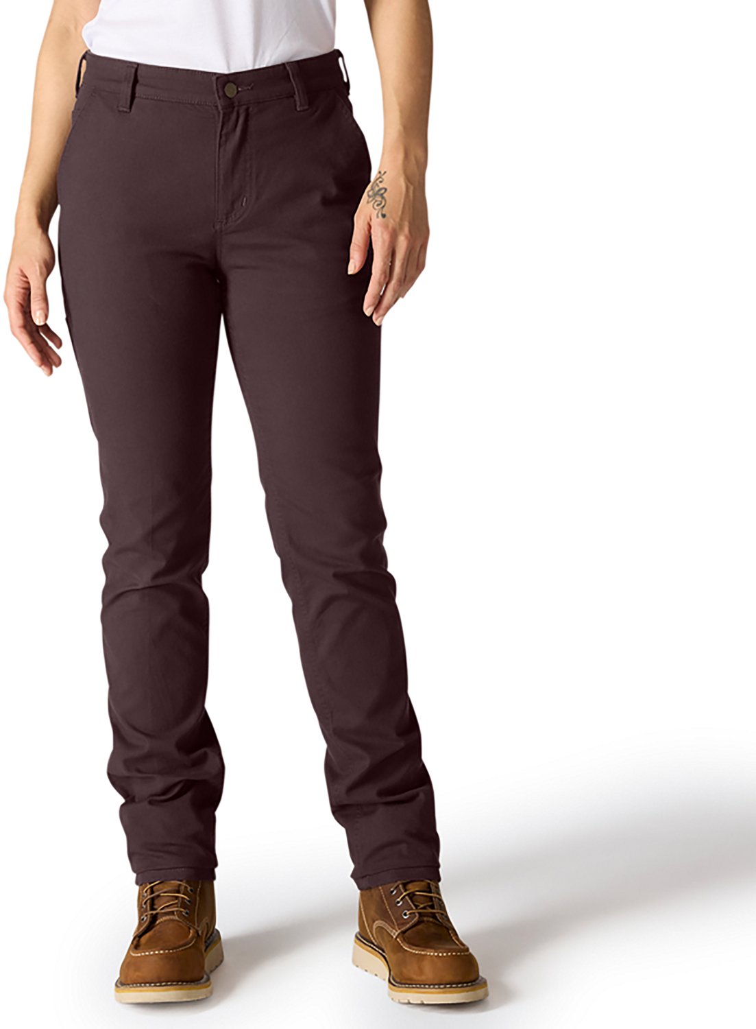 Get ready for the work day with the Carhartt Women's Rugged Flex Work Pants. The cotton and spandex micro sand canvas fabric provides a comfortable feel, while the Rugger Flex technology promotes mobility. The high rise design in the back offers coverage, and the stretch waistband delivers a custom fit.