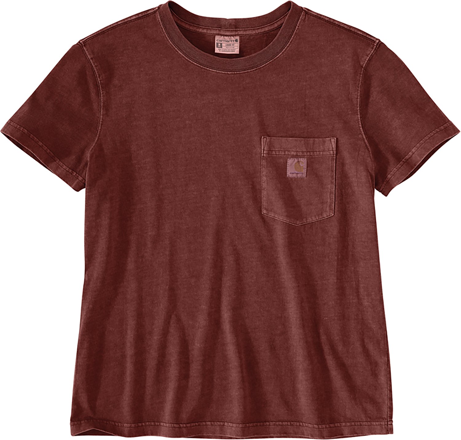 Be comfortable no matter what you're doing in the Carhartt Women's Short Sleeve Garment Dye Pocket T-shirt. This t-shirt is made from preshrunk midweight cotton that feels soft and lightweight. The garment-dyed pattern and left-chest pocket add updated style to a classic look.