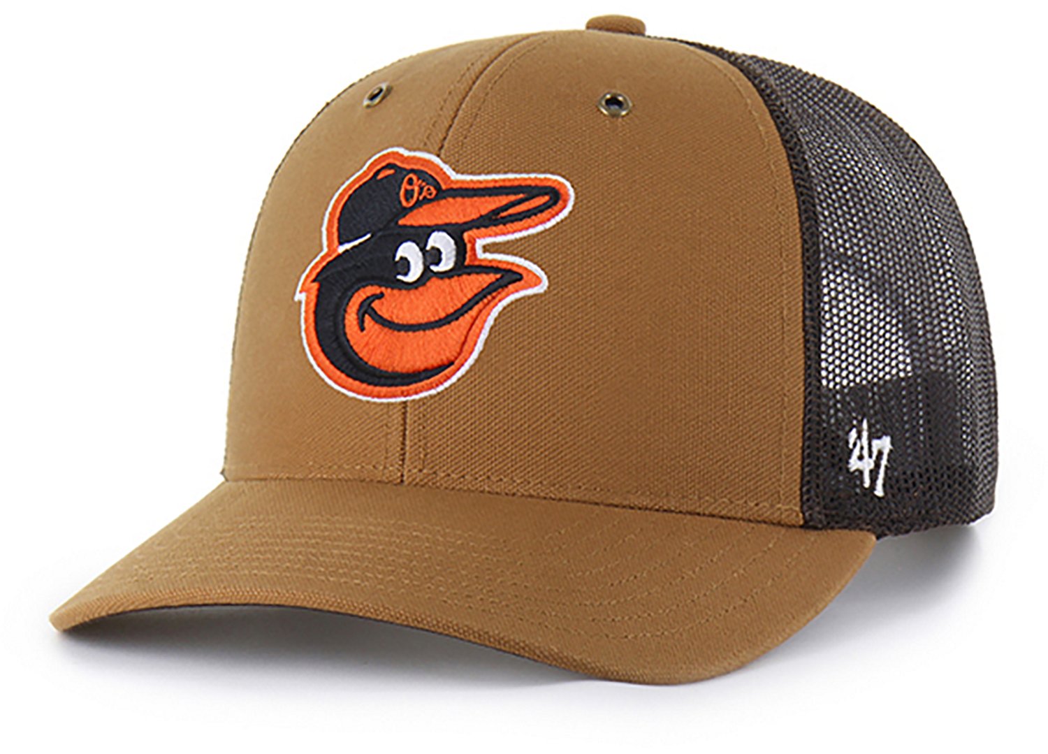 Show off your love for your favorite team by throwing on the Carhartt x '47 Adults' Orioles Trucker Cap. This cap is made of duck cloth with a mesh back and eyelets to offer ventilation, and the embroidered team logo on the front grabs attention from other fans.