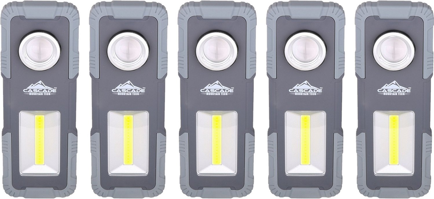 Light up your campsite with the Cascade Mountain Tech Multi-Use LED Light 5-Pack. The area light provides illuminates larger spaces, while the spotlight produces a narrow beam of light to focus on particular objects. An adjustable kickstand, magnetic base and 360-degree hook provide 3 different ways to brighten up your site, and the compact size makes it easy for you to store and transport these lights.