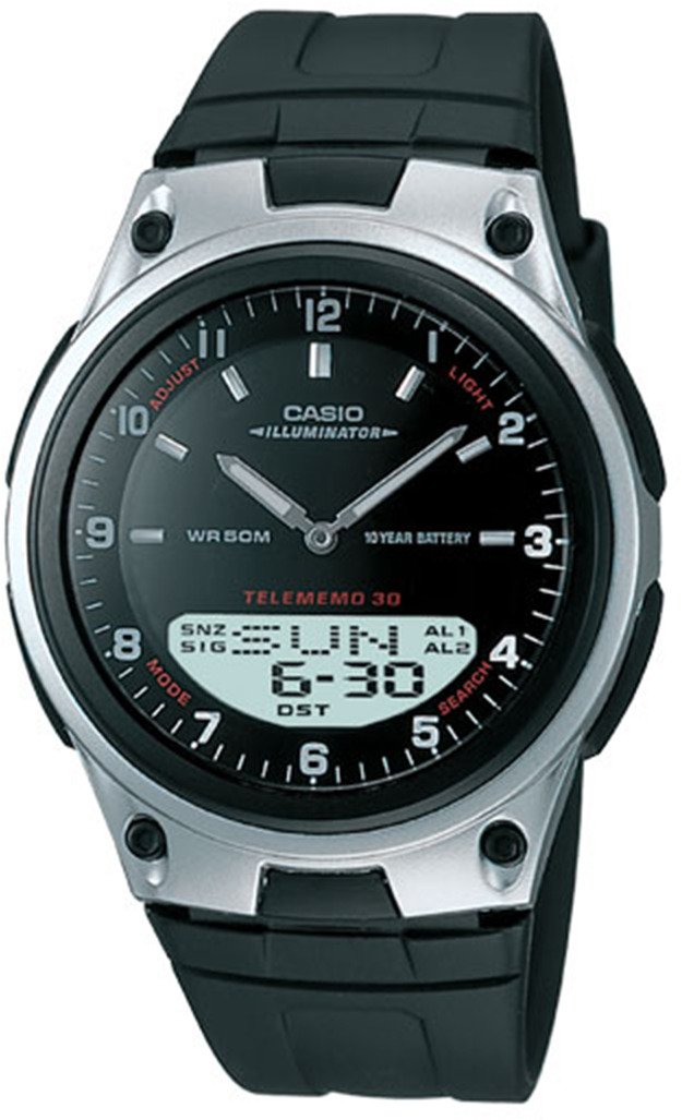 Be fashionably on time with the Casio Men's AW80-1AV Analog/Digital Sport Watch, which features a combined analog and digital dial face with Arabic numerals at every hour, minute indexes and an easy-to-read day, date and month display. The stainless-steel case and resin bezel are held secure with a black resin band. Water-resistant to 50 m.