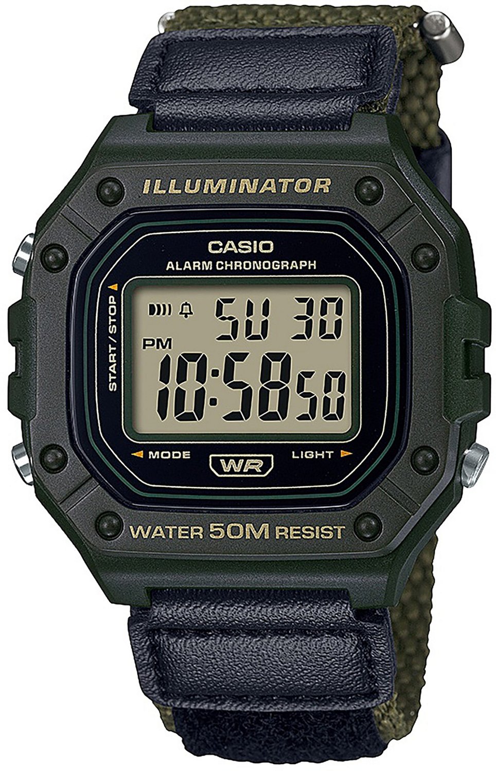 Keep time while accessorizing for style with the Casio Men's Classic Digital Velcro Strap Watch. This sporty watch features a stainless steel bezel and a secure velcro strap. The digital display keeps track of date and time with a 1/100 second stopwatch for sports and an LED light allows for easy reading in the dark.