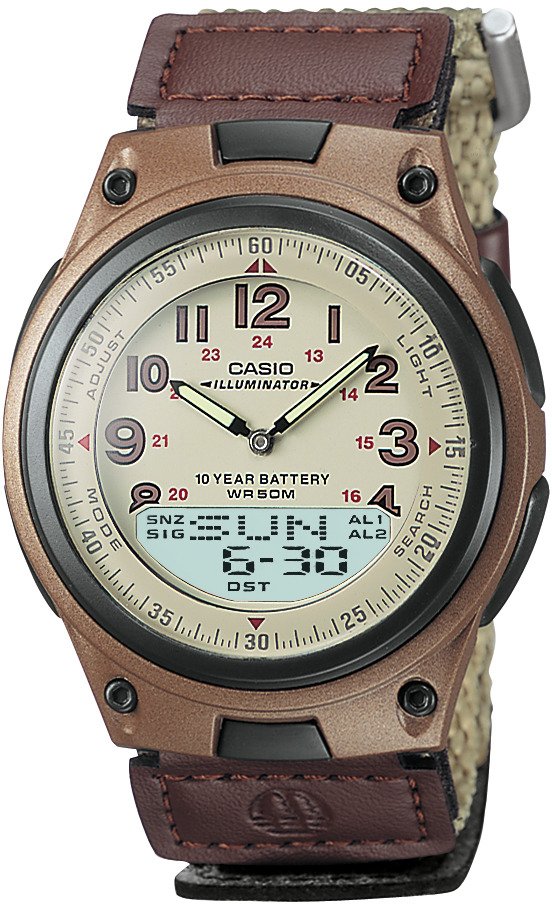 The Casio Men's Classic World Time Data Bank Analog/Digital Watch informs you of the time with a digital subdial that displays the day and date. The watch also displays world time and provides information on 29 times zones (30 cities), city code display and optional daylight savings. The LED light with Afterglow makes viewing the information in low-light conditions easy, and the watch features a 30-page databank capacity with auto sort. 1/100th-second stopwatch. 24-hour countdown timer. 50 m water resistance.