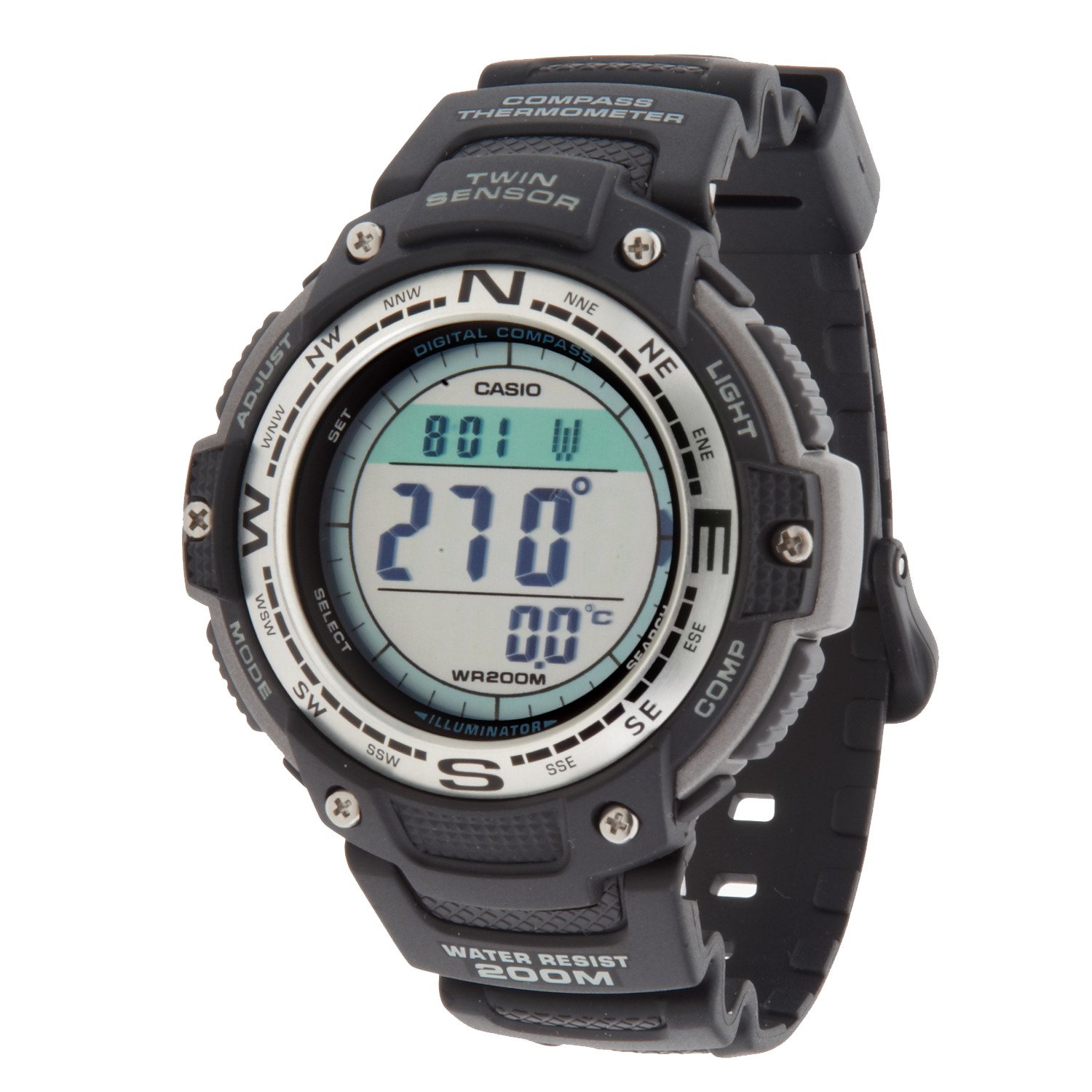 Move in the right direction with the Casio Men's Digital Compass Twin Sensor Watch. An eye-catching digital display is housed within a resin case, and a resin strap with a buckle keeps the watch securely on your wrist. A digital compass offers easy navigation, and the thermometer provides an accurate temperature gauge for your various adventures. This watch is water-resistant to 200 m, so you can consistently depend on the precision of the quartz movement. The Illuminator night-light illuminates the watch face in low-light conditions, and the alarm keeps you on track throughout the day.