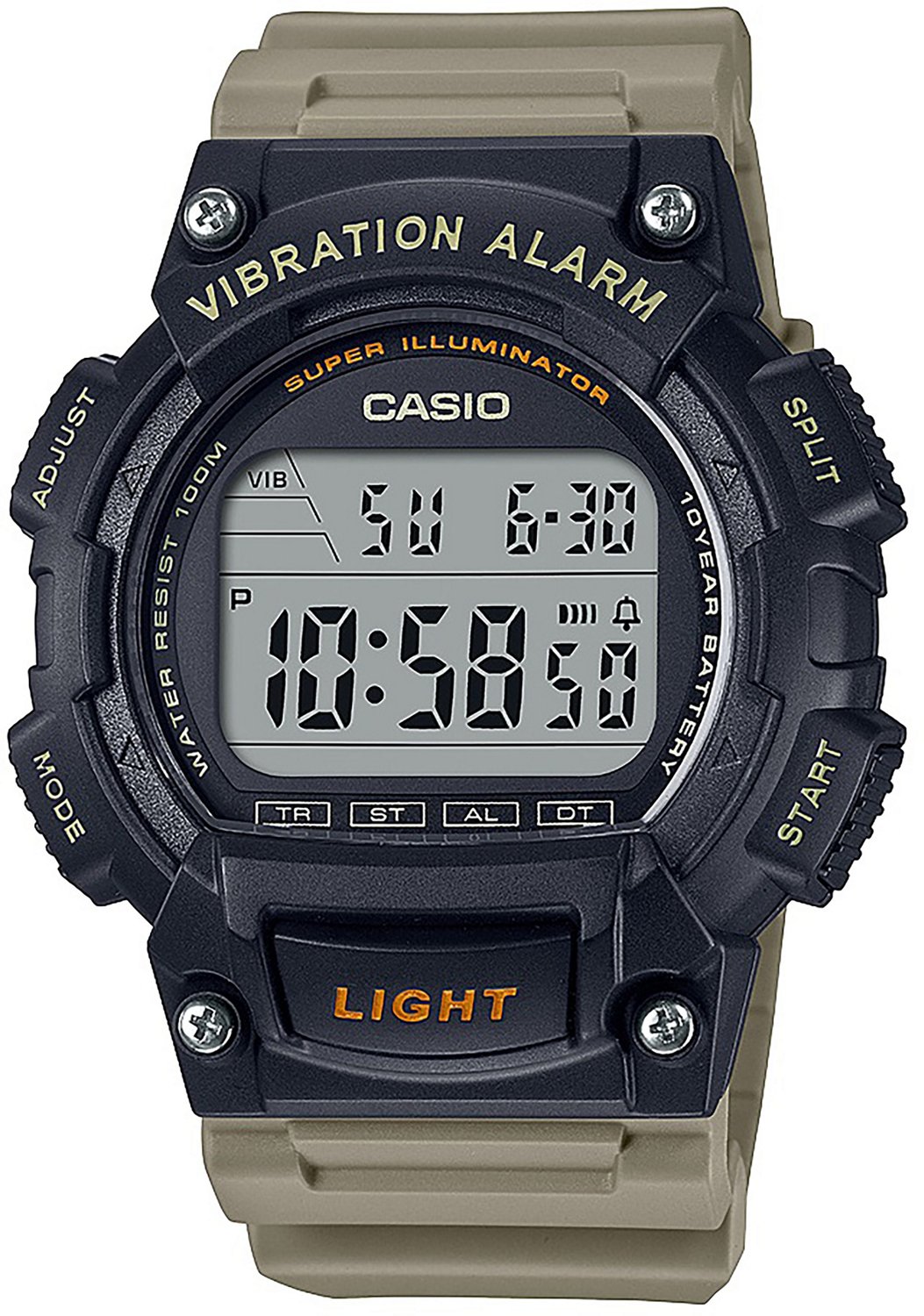 Keep time while accessorizing with a Casio Men's Digital Resin Strap Watch. This military-inspired watch features a mineral face set in durable resin. A large digital display with LED Super Illuminator lighting makes reading easy, while a vibrating alarm delivers subtle alerts when manners matter.