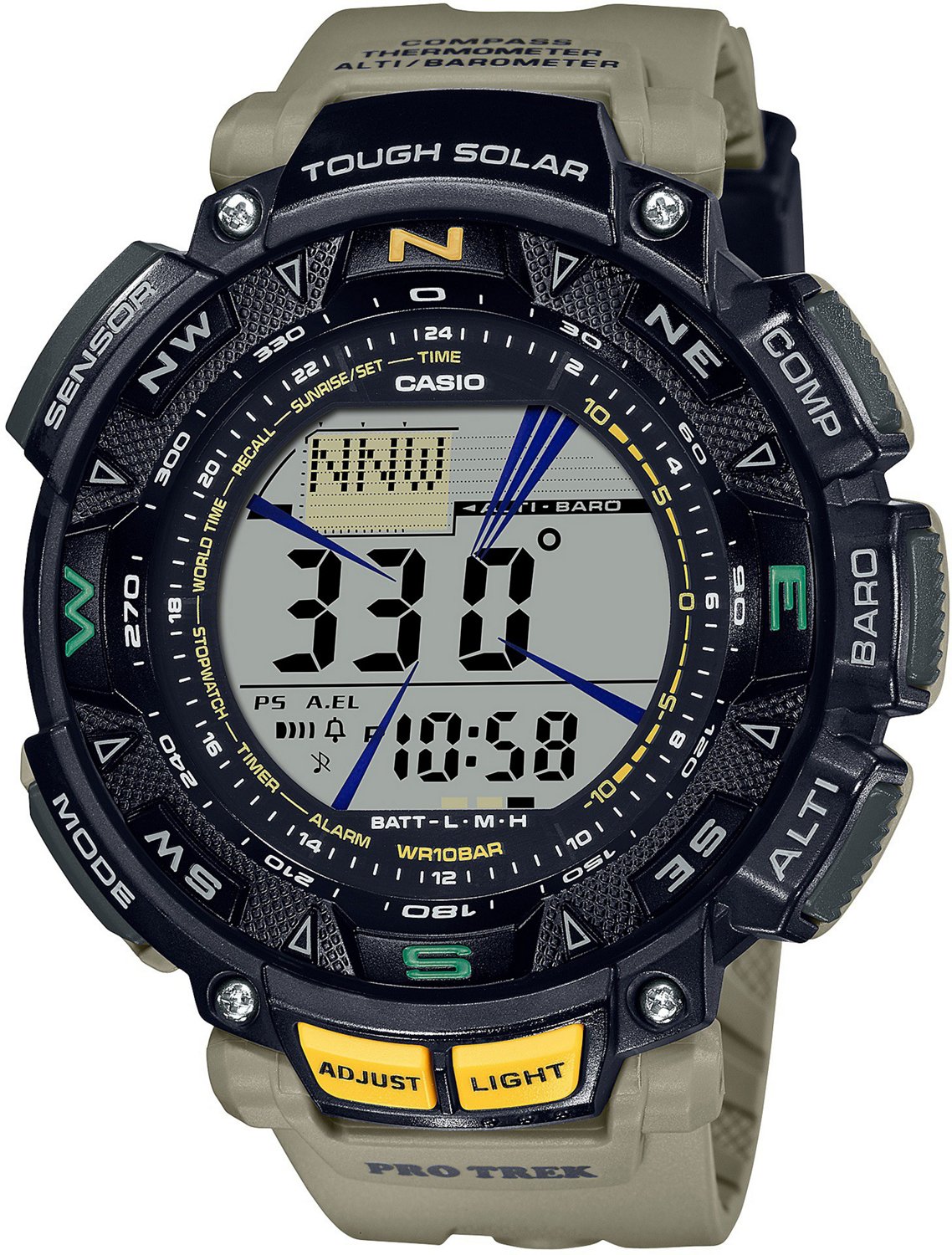 Stay steps ahead of the day when you wear the Casio Men's ProTrek Triple Sensor Digital Resin Sport Watch. The Duplex LC display provides crisp, clear reads and features a full-auto electro-luminescent backlight for convenient use in low-light settings. The TOUGH SOLAR power helps ensure consistent operations, while the modes allow you to keep track of world time, sunrise time, compass directions, temperature and more as you enjoy adventures.