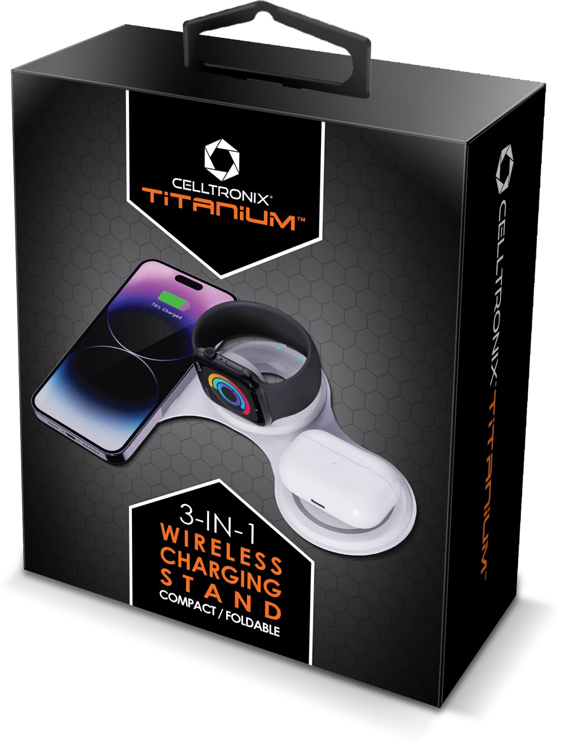 Keep your devices charge with the Celltronix 3-in-1 Wireless Charging Stand. The 3-in-1 design supports versatile charging, while wireless technology eliminates the need for plugs.