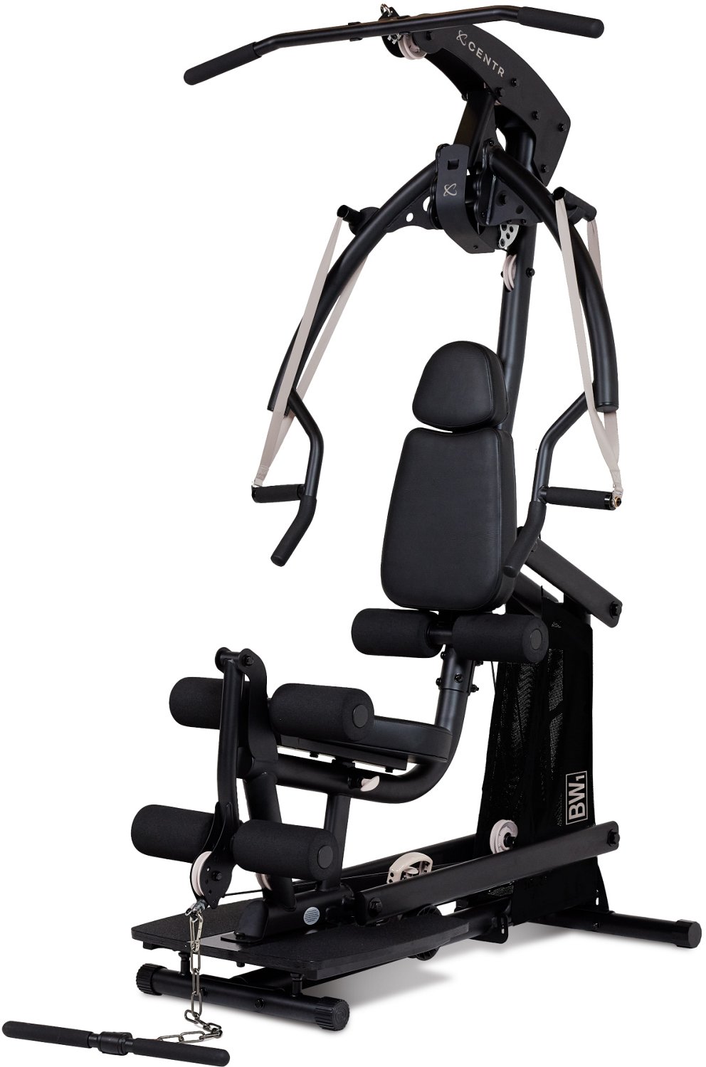 Get a full-body resistance workout at home with the CENTR Body Weight Home Gym Machine. This compact steel frame fits in small spaces and supports up to 300 pounds. It is easy to use, and has a 1-handed adjustment lever, allowing you to customize your resistance level from 10 to 150% of your body weight. The high and low pulleys, fixed press arm, leg and curl extension system, free movement handles, revolving straight bar and lateral bar add versatility.
