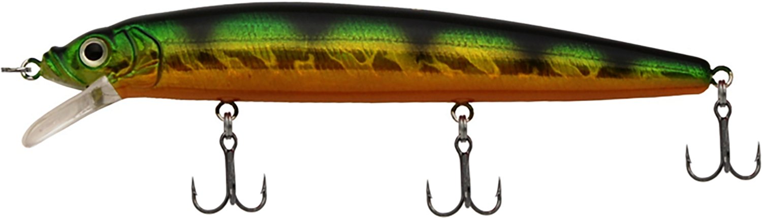 Enhance your fishing trip when you use the Challenger Lures Challenger 3/8 oz. Minnow. Its clear body reduces the chance to spook fish. The bright green head improves visibility in murky waters, and its 3 treble hooks help to maximize hook rates.