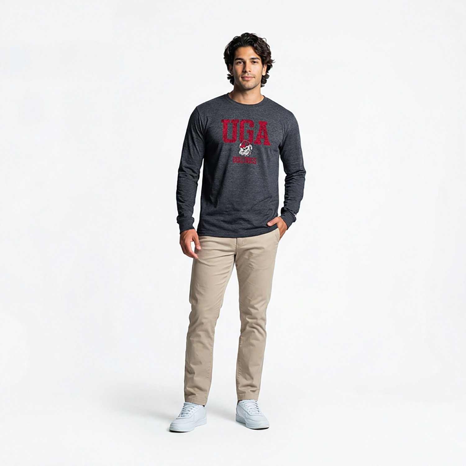 Cheer on your favorite team while wearing the Champion Men's Georgia School Initials Over Mascot Triumph Long Sleeve T-shirt. The polyester, cotton and rayon construction provides a blend of comfort and durability, while the team graphic lets everyone know who you root for on game day.