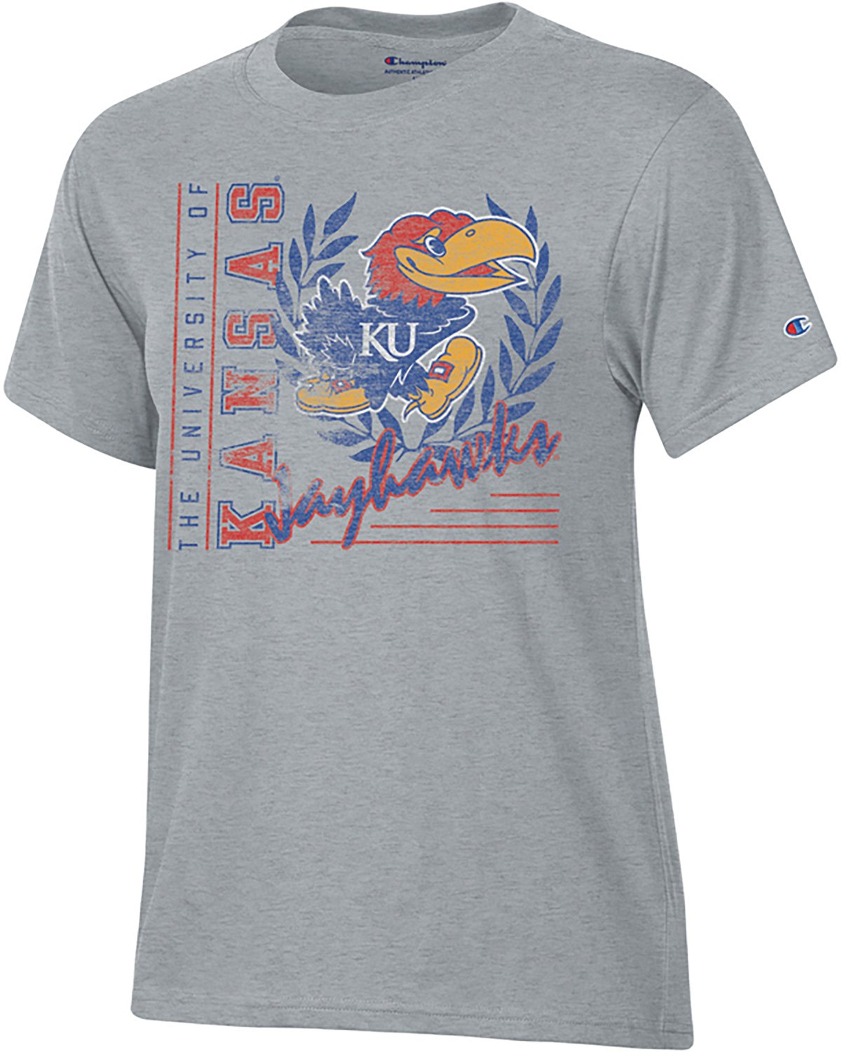 Everyone will get excited for the next game when you wear the Champion Women's Kansas Mascot Script Stadium T-shirt. This T-shirt is made of 60% cotton and 40% polyester to provide lasting comfort, and the team graphics helps you display your fan pride.