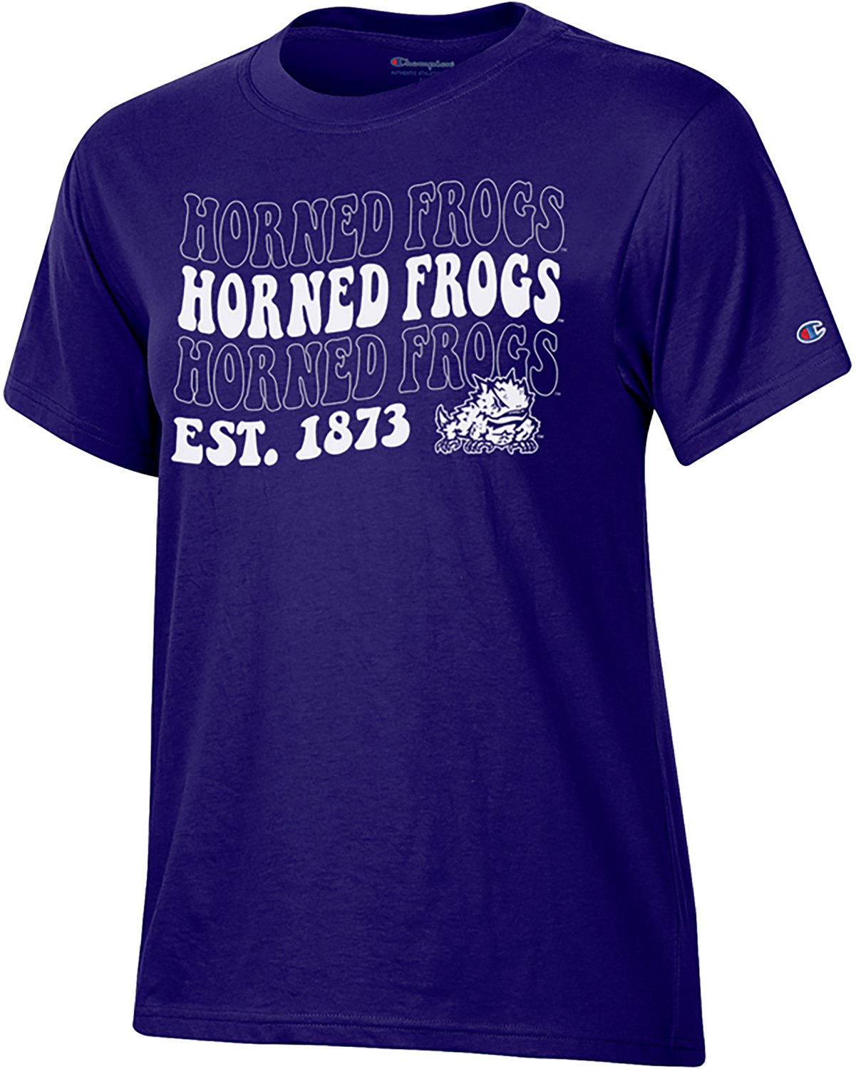 Help get other fans excited for the upcoming game by wearing the Champion Women's TCU Retro School T-shirt. This T-shirt is made of cotton and polyester with a crew neck and short sleeves for comfort and features a team name and mascot logo graphic to rep your favorite school.