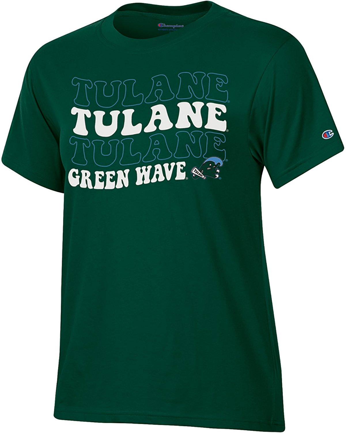 Help get other fans excited for the upcoming game by wearing the Champion Women's Tulane Retro School T-shirt. This T-shirt is made of cotton and polyester with a crew neck and short sleeves for comfort and features a team name and mascot logo graphic to rep your favorite school.